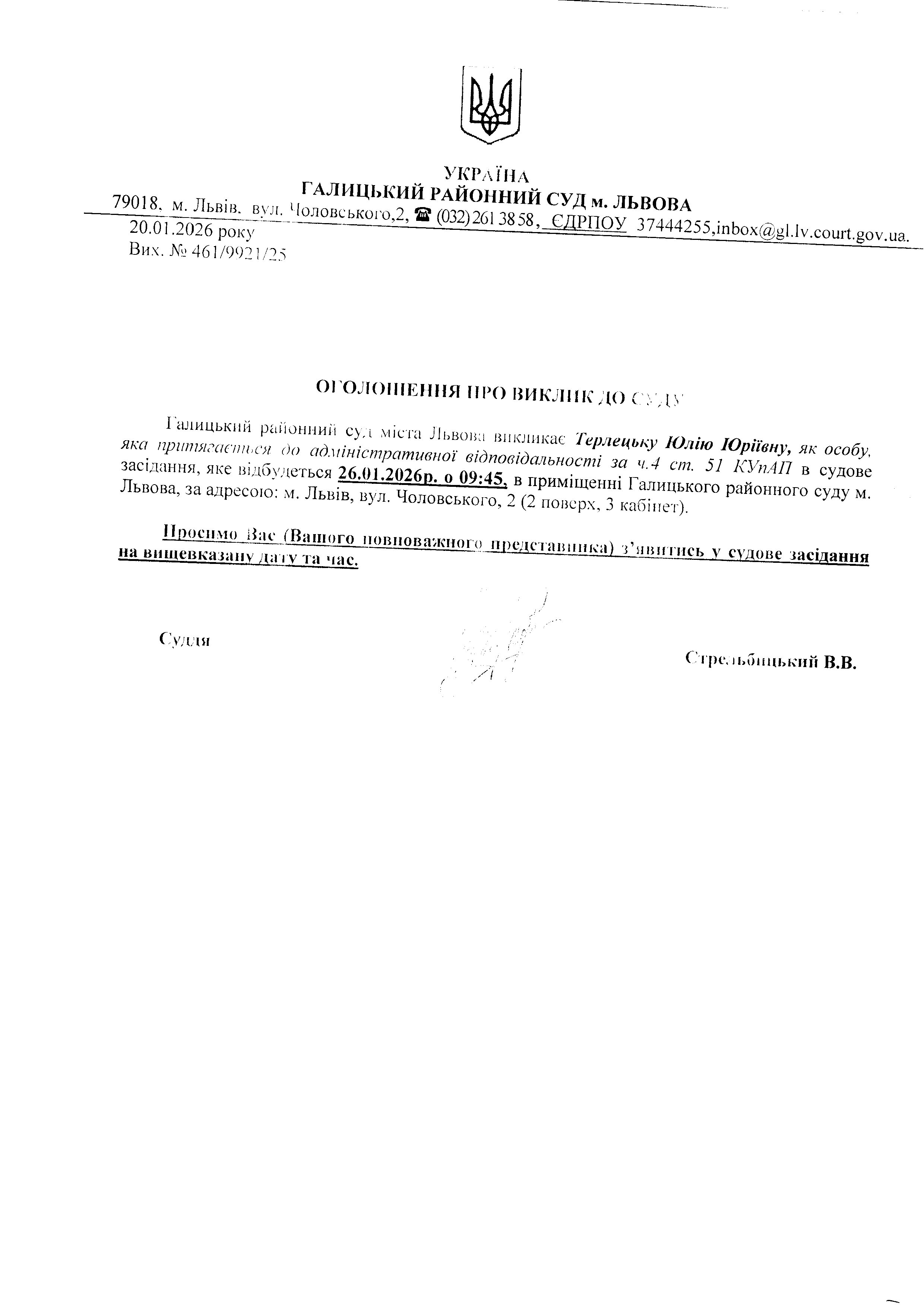 оголошення про виклик Терлецьку Ю.Ю.