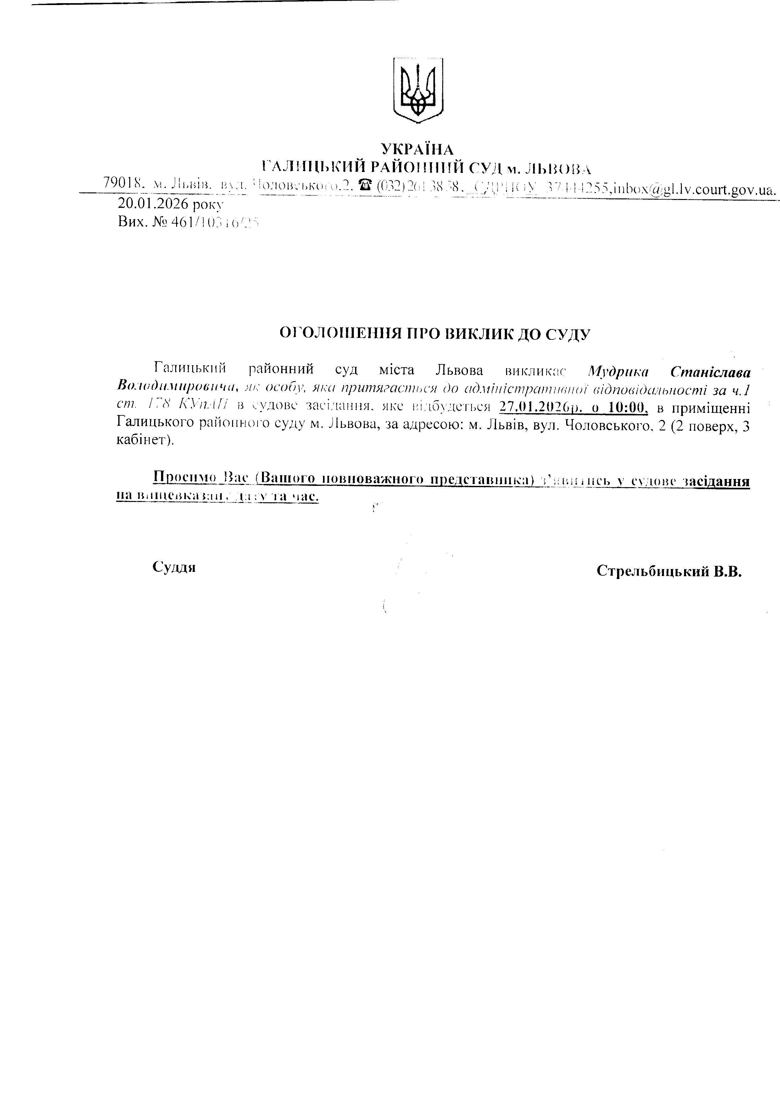 оголошення про виклик Мудрик С.В.