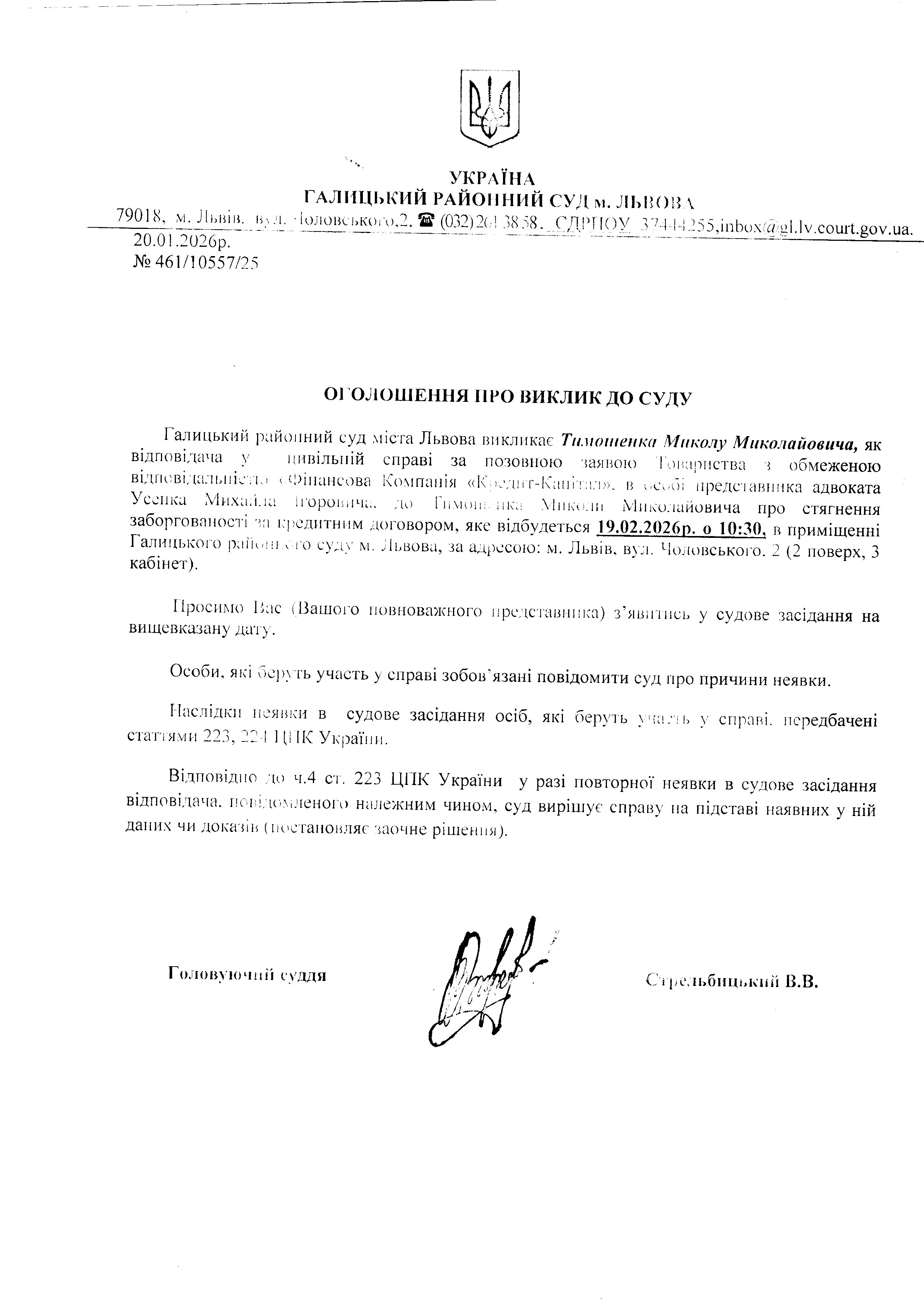оголошення про виклик Тимошенка М.М.