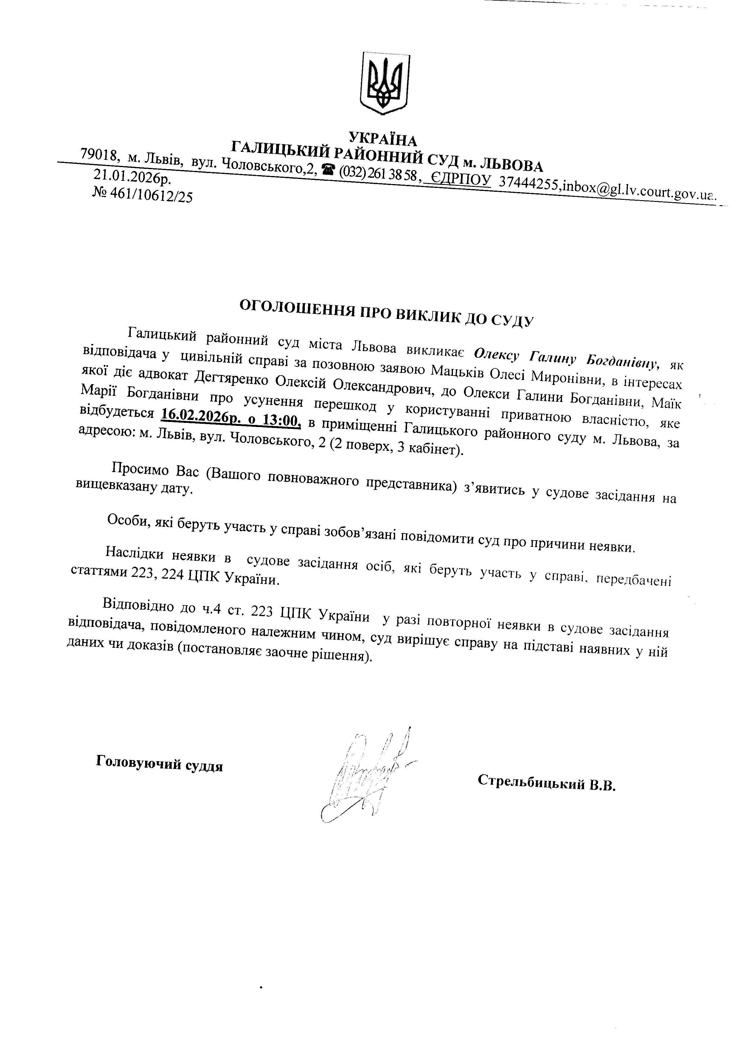 оголошення про виклик Олексу Г.Б.
