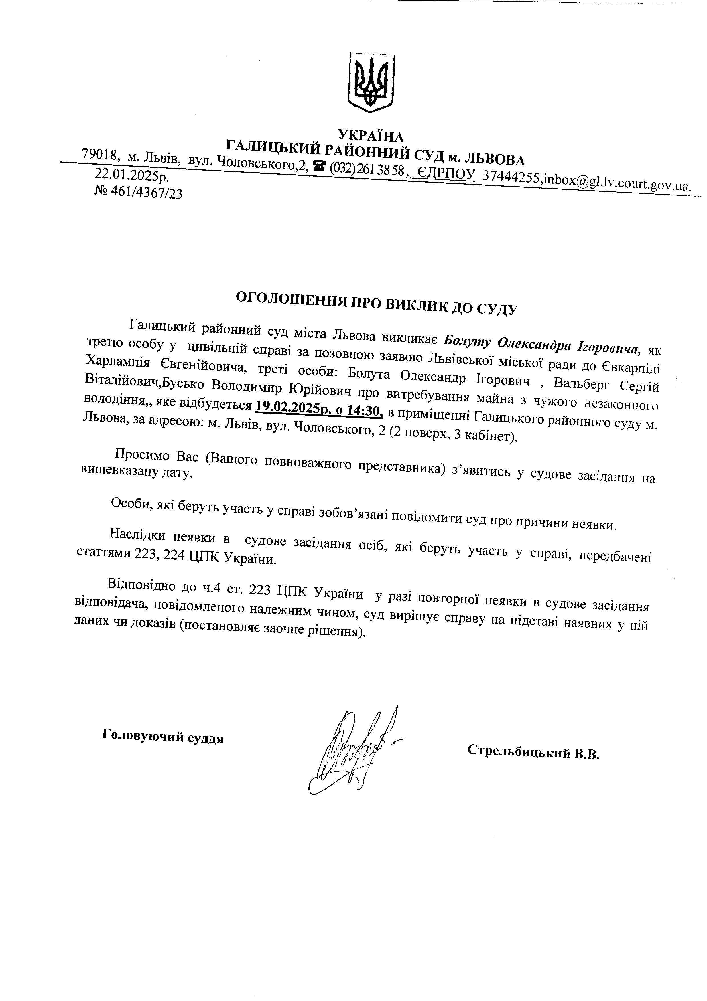 оголошення про виклик Вальберга С.В.