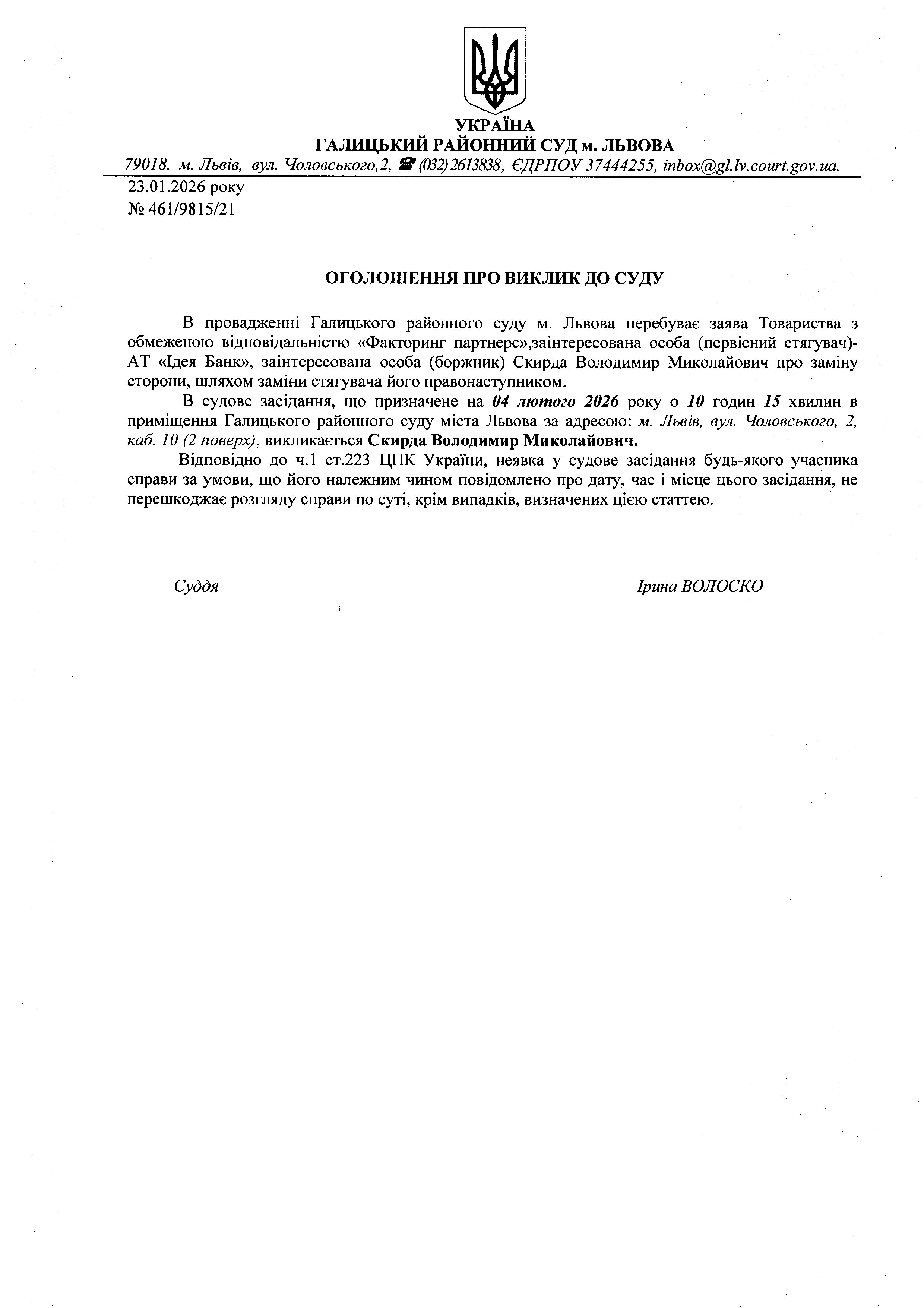 оголошення про виклик Скирда В.М.