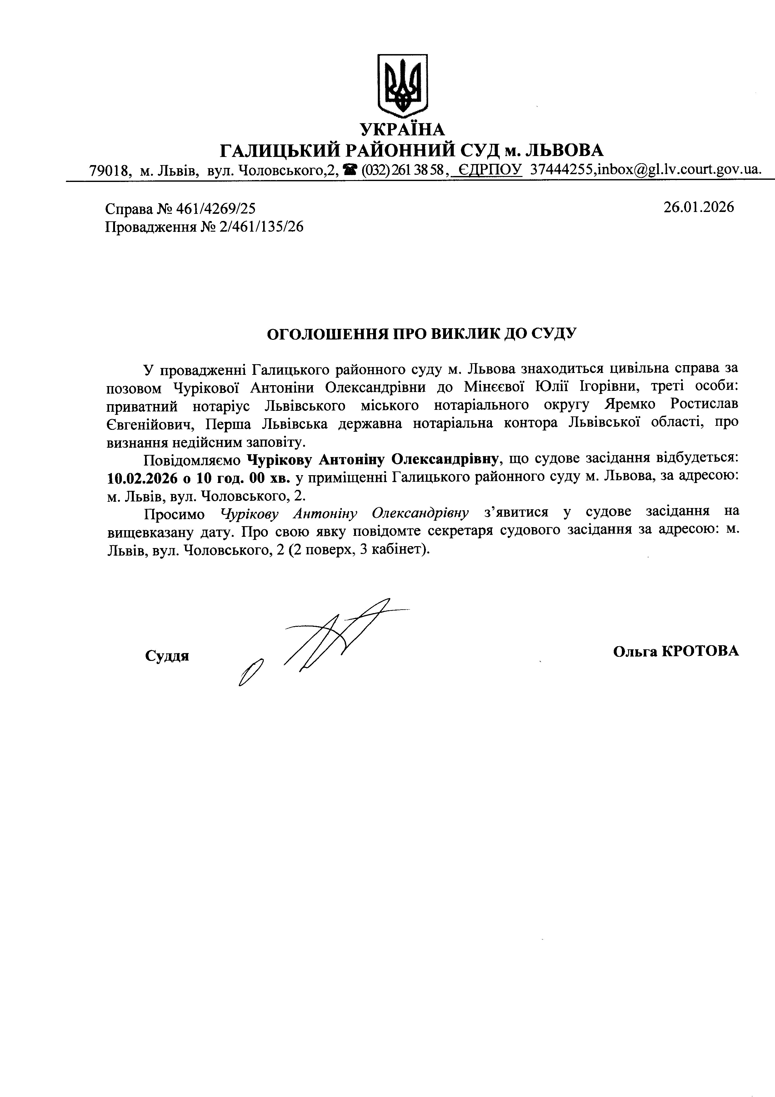 оголошення про виклик Чурікову А.О.