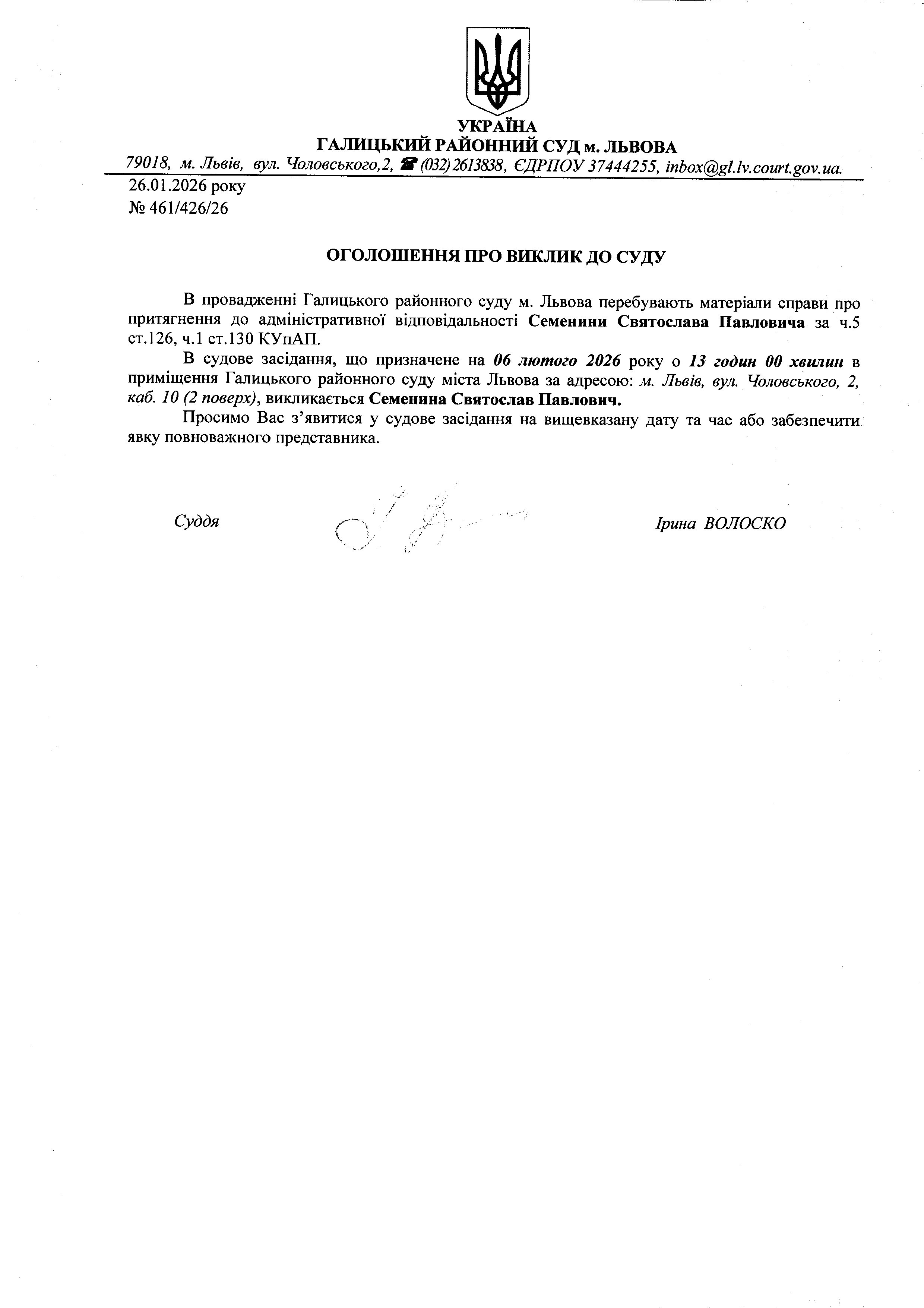 оголошення про виклик Семенина С.П.