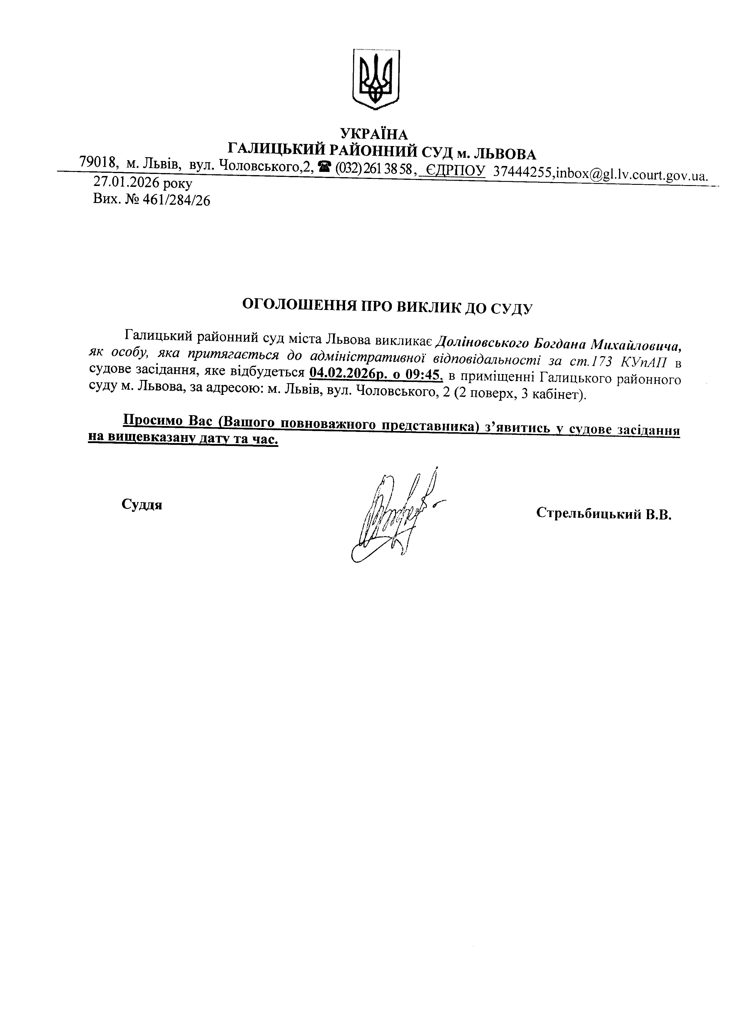 оголошення про виклик Доліновського Б.М.