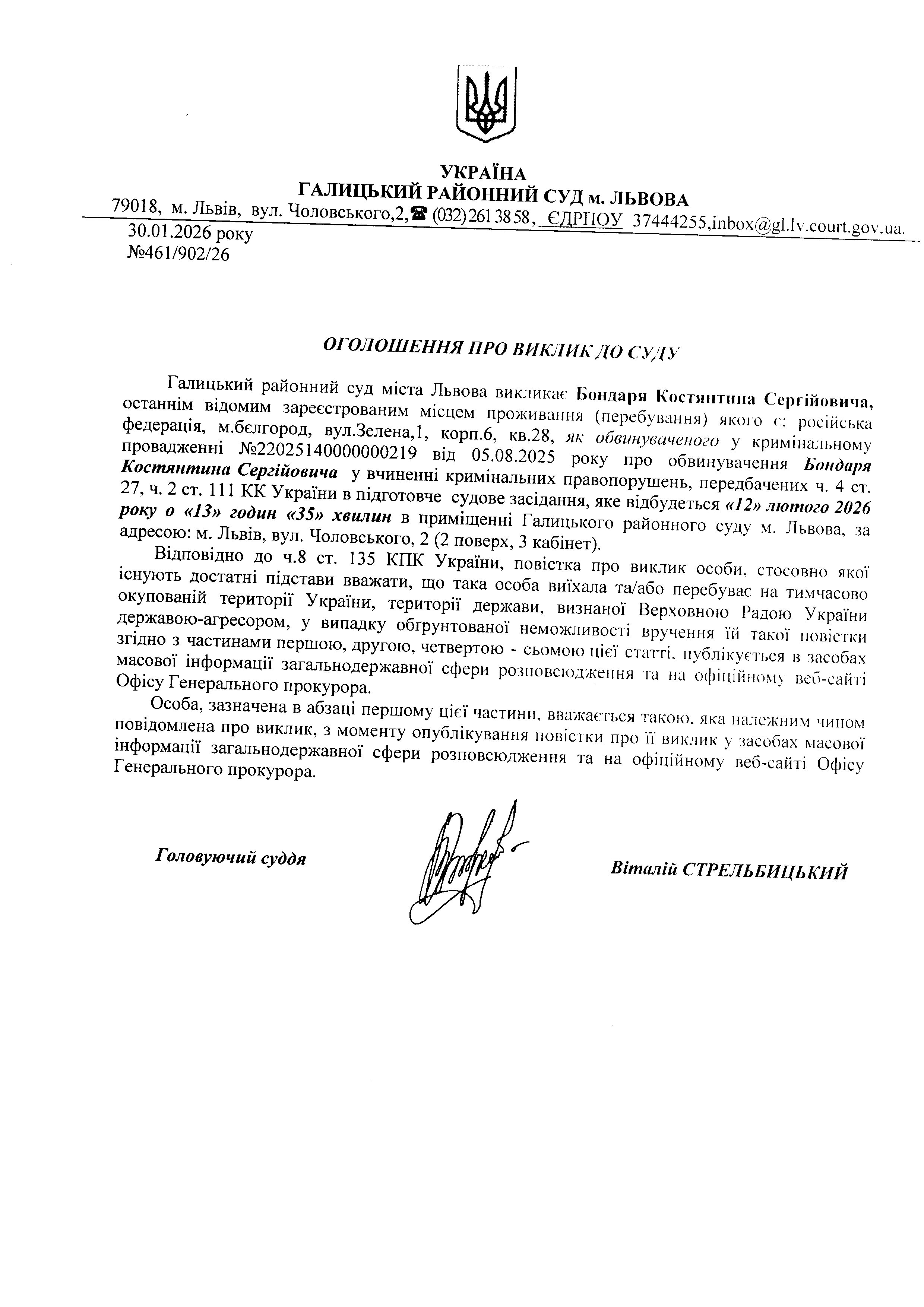оголошення про виклик Бондаря К.С.