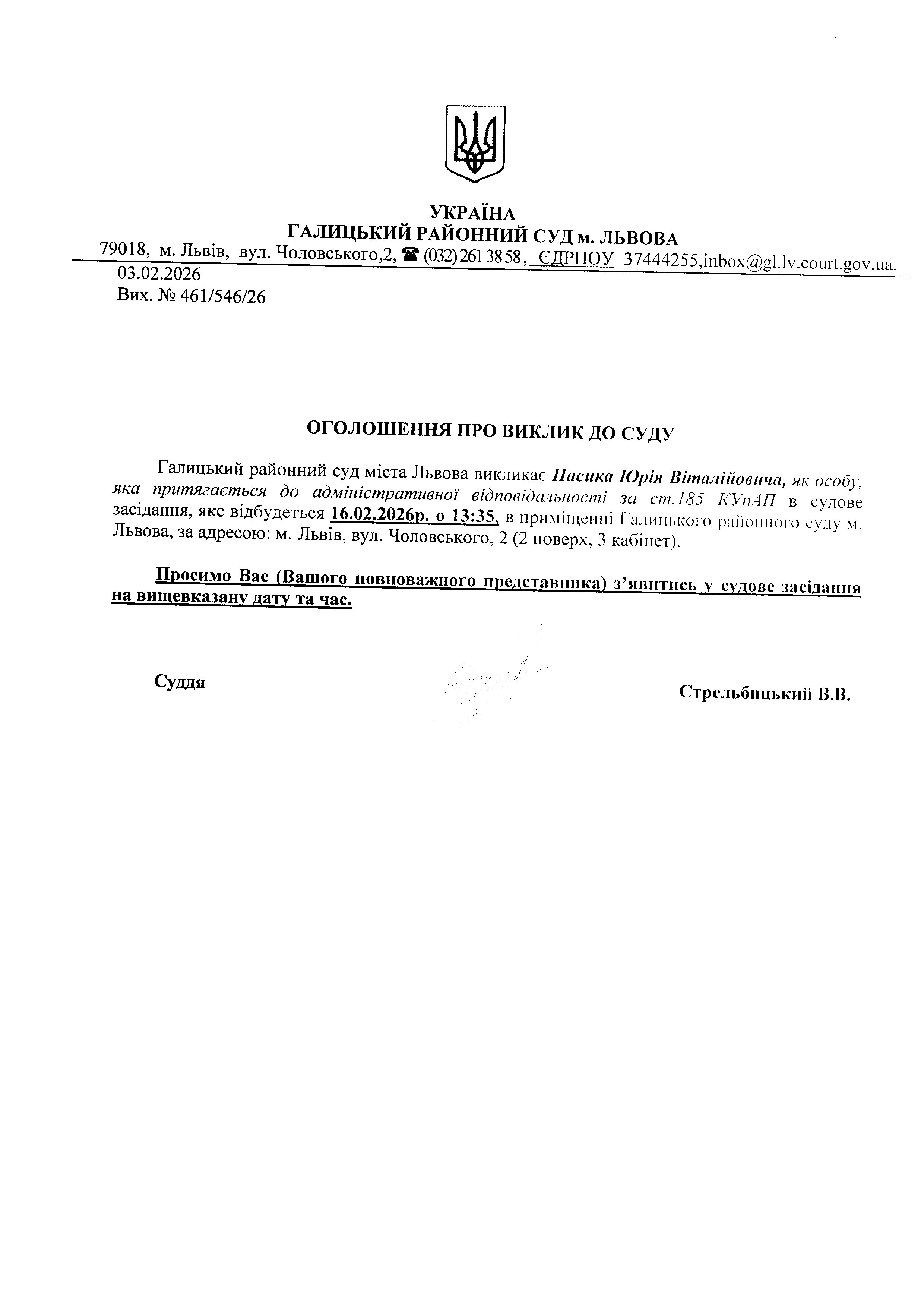 оголошення про виклик Пасика Ю.В.