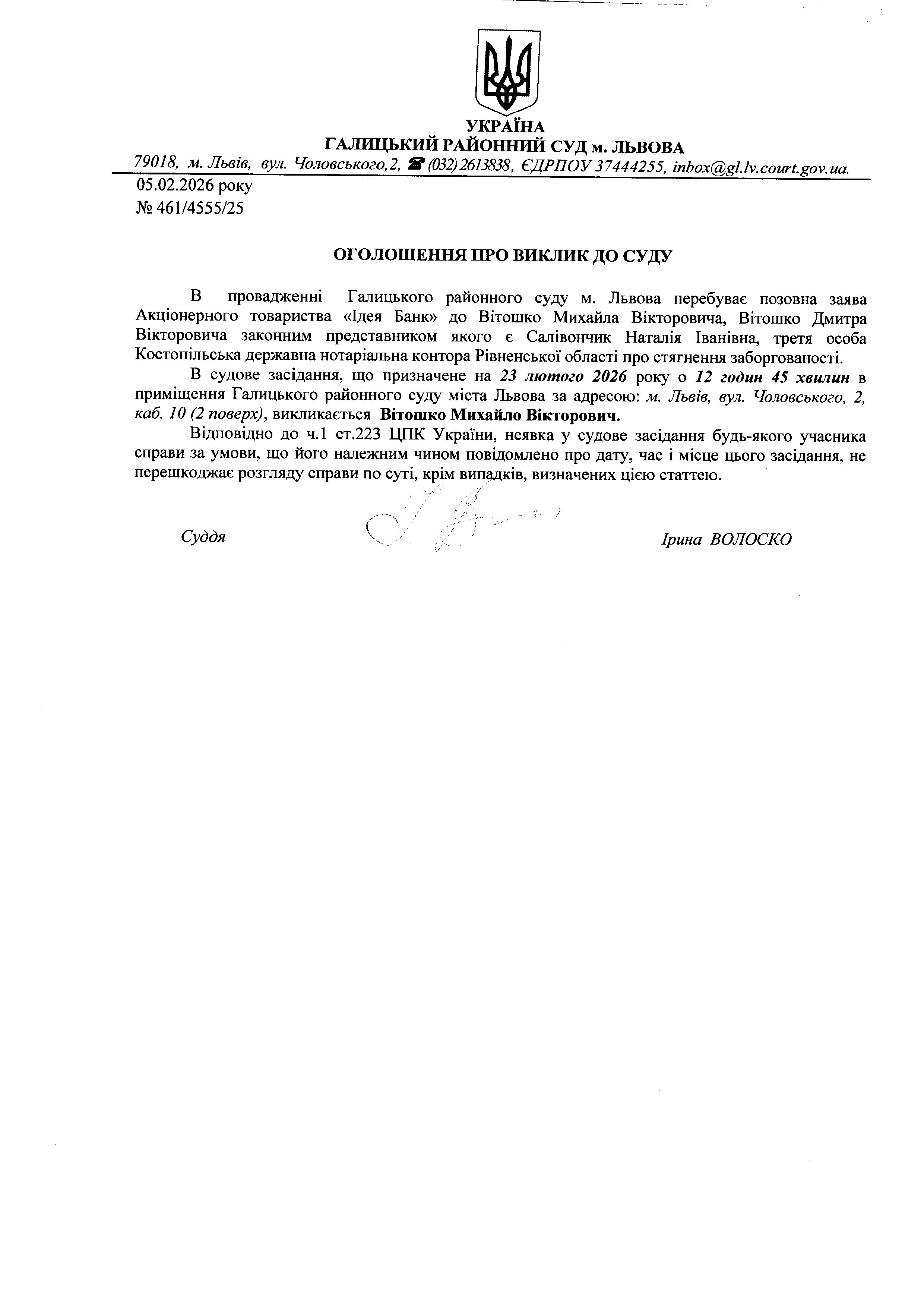 оголошення про виклик Вітошко М.В.