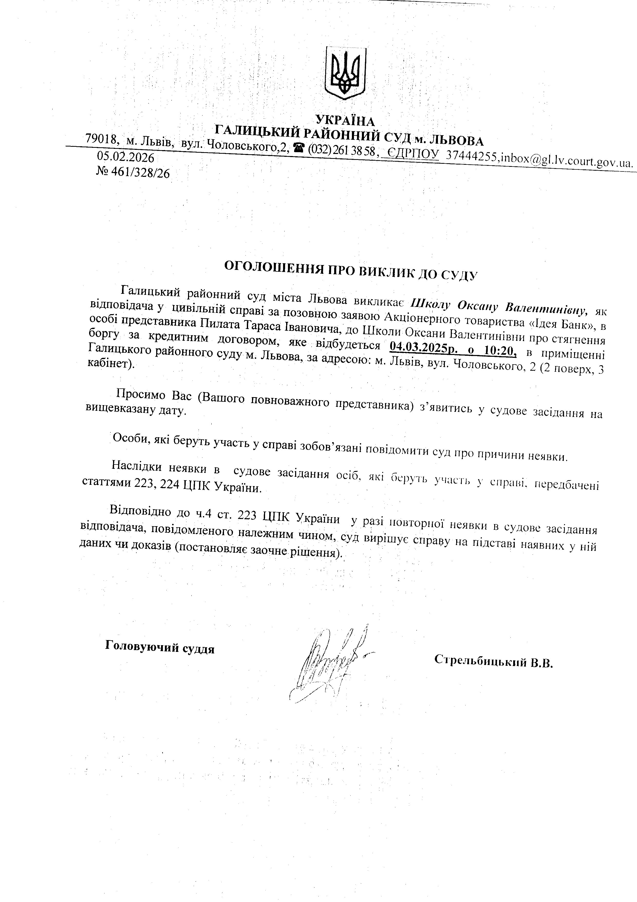 Оголошення про виклик до суду Школу О.В.