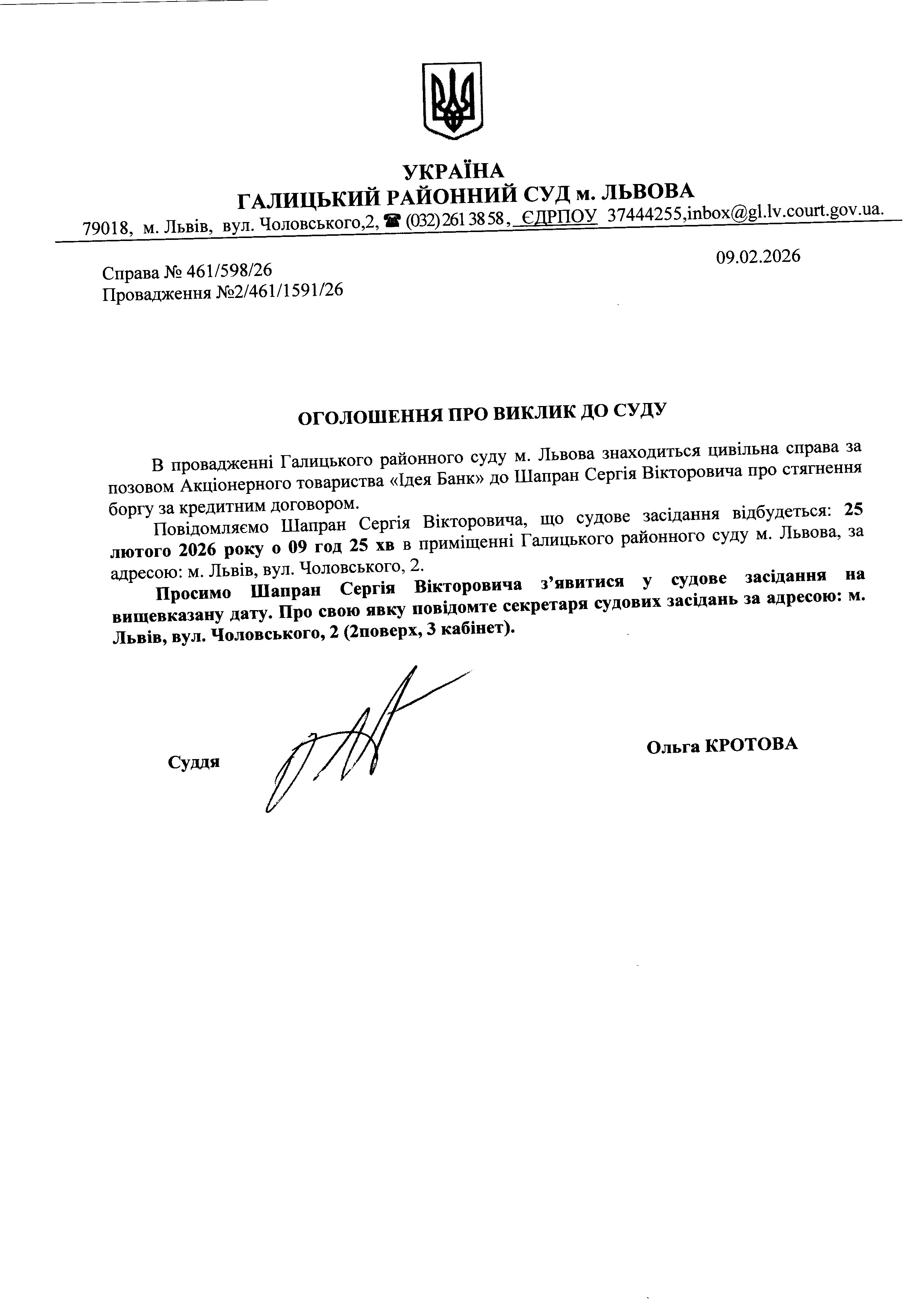 Оголошення про виклик до суду Шапран С.В.