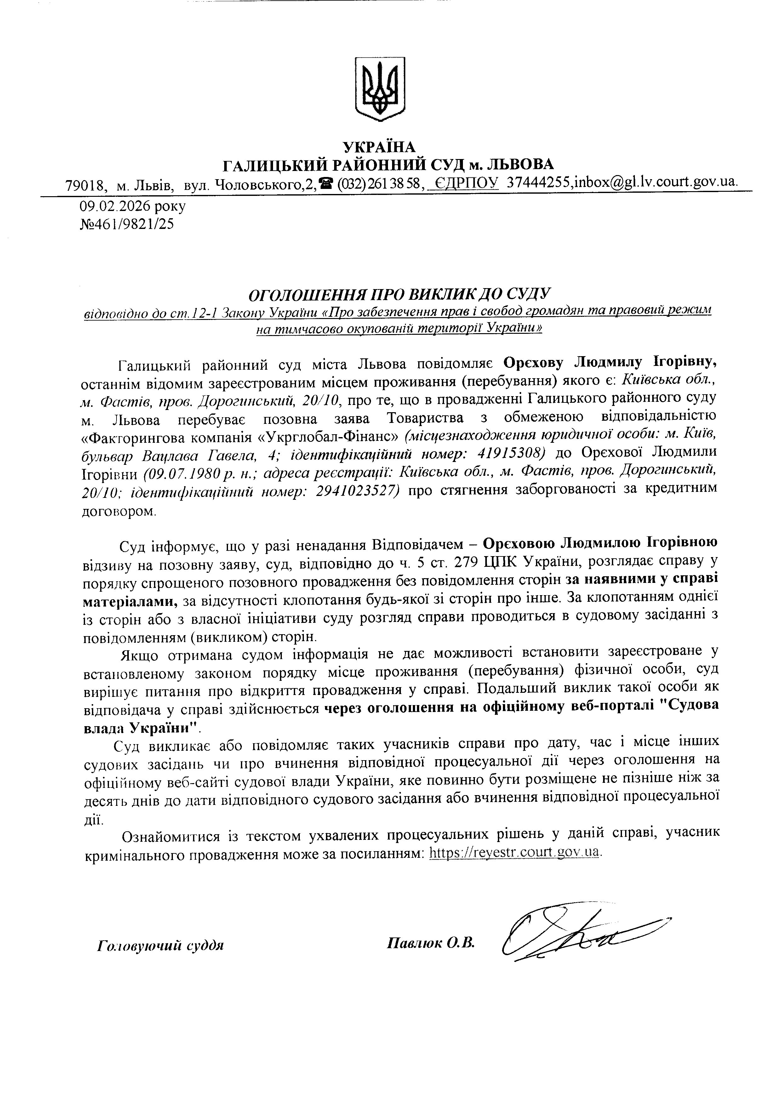 Оголошення про виклик до суду Орєхової Л.І.