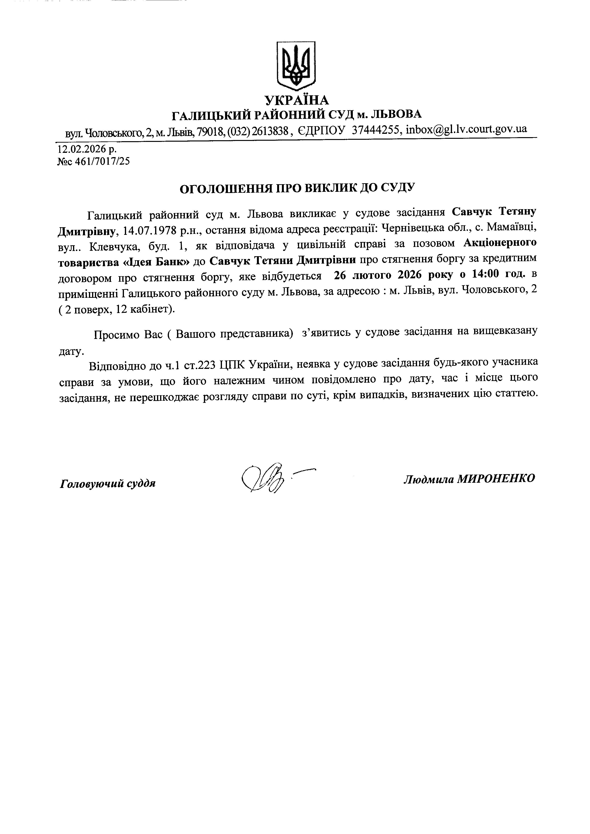 Оголошення про виклик до суду Савчук Т.Д.