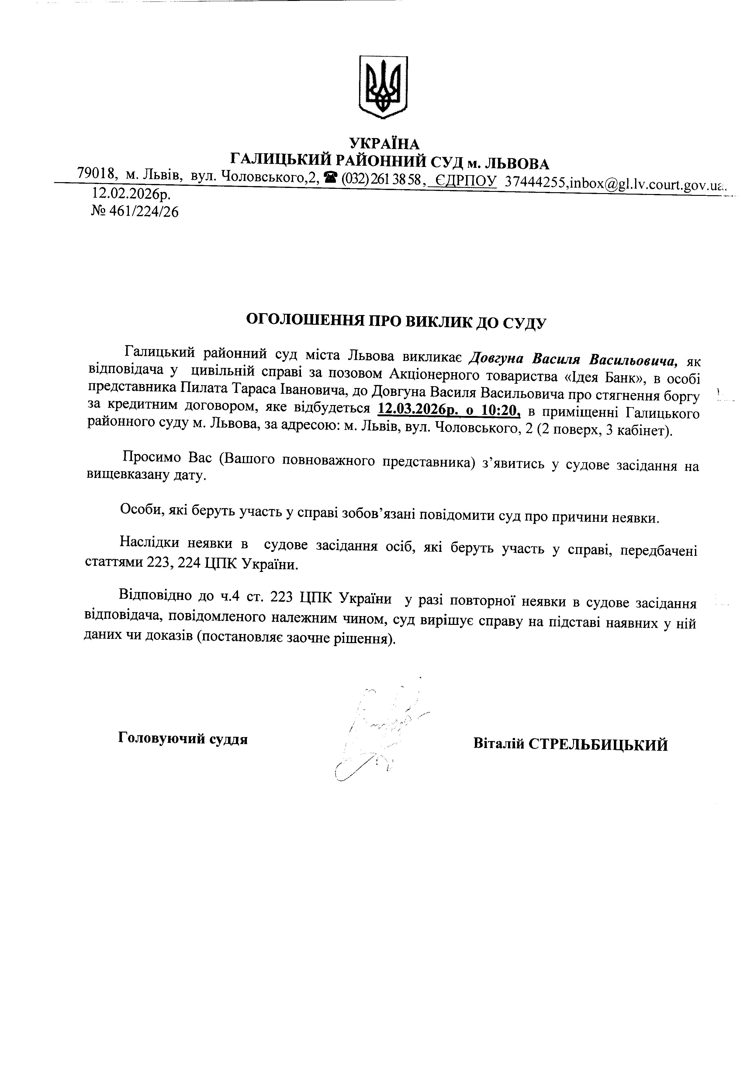 Оголошення про виклик до суду Довгуна В.В.