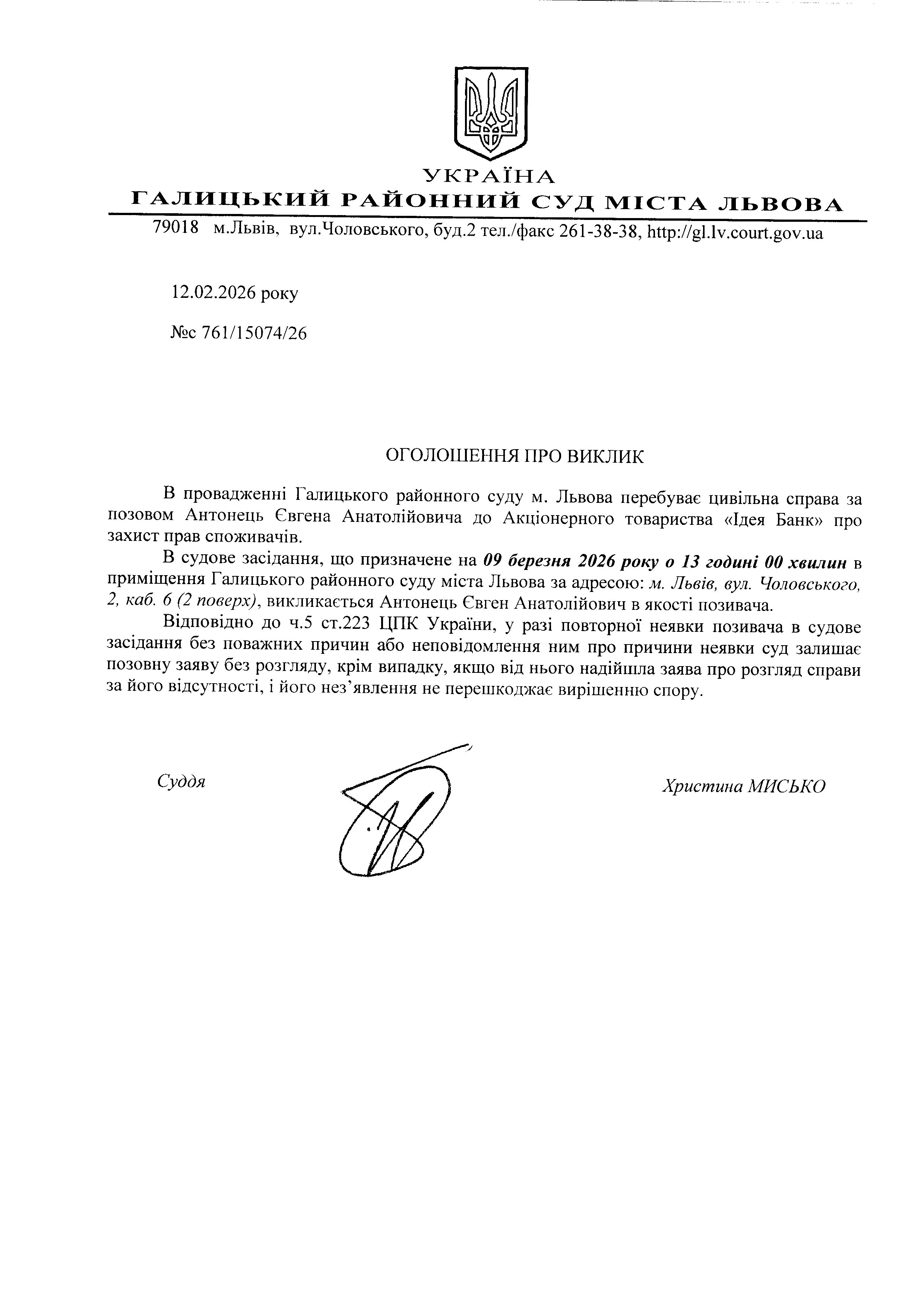 Оголошення про виклик до суду Антонець Є.А.