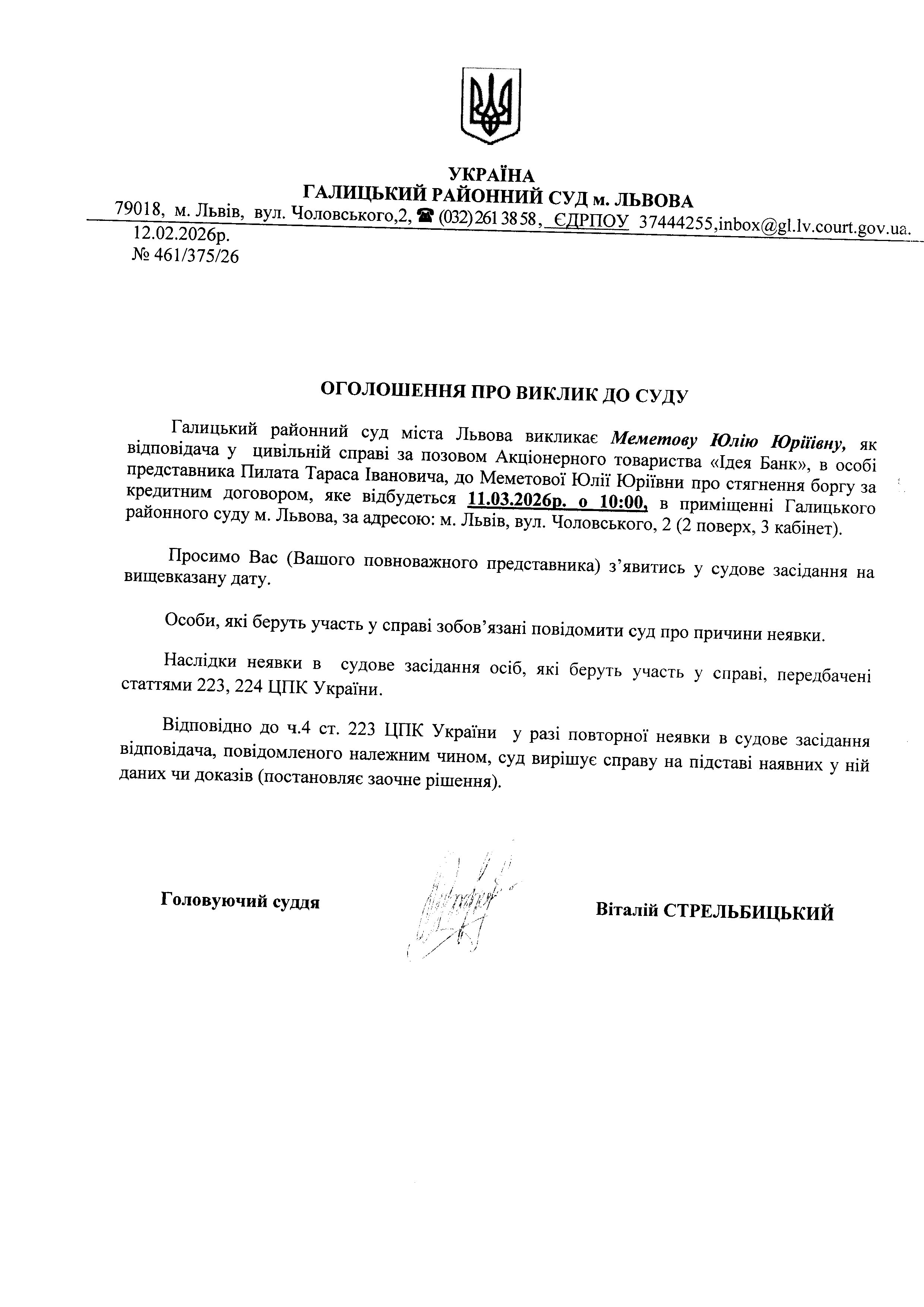 Оголошення про виклик до суду Меметової Ю.Ю.