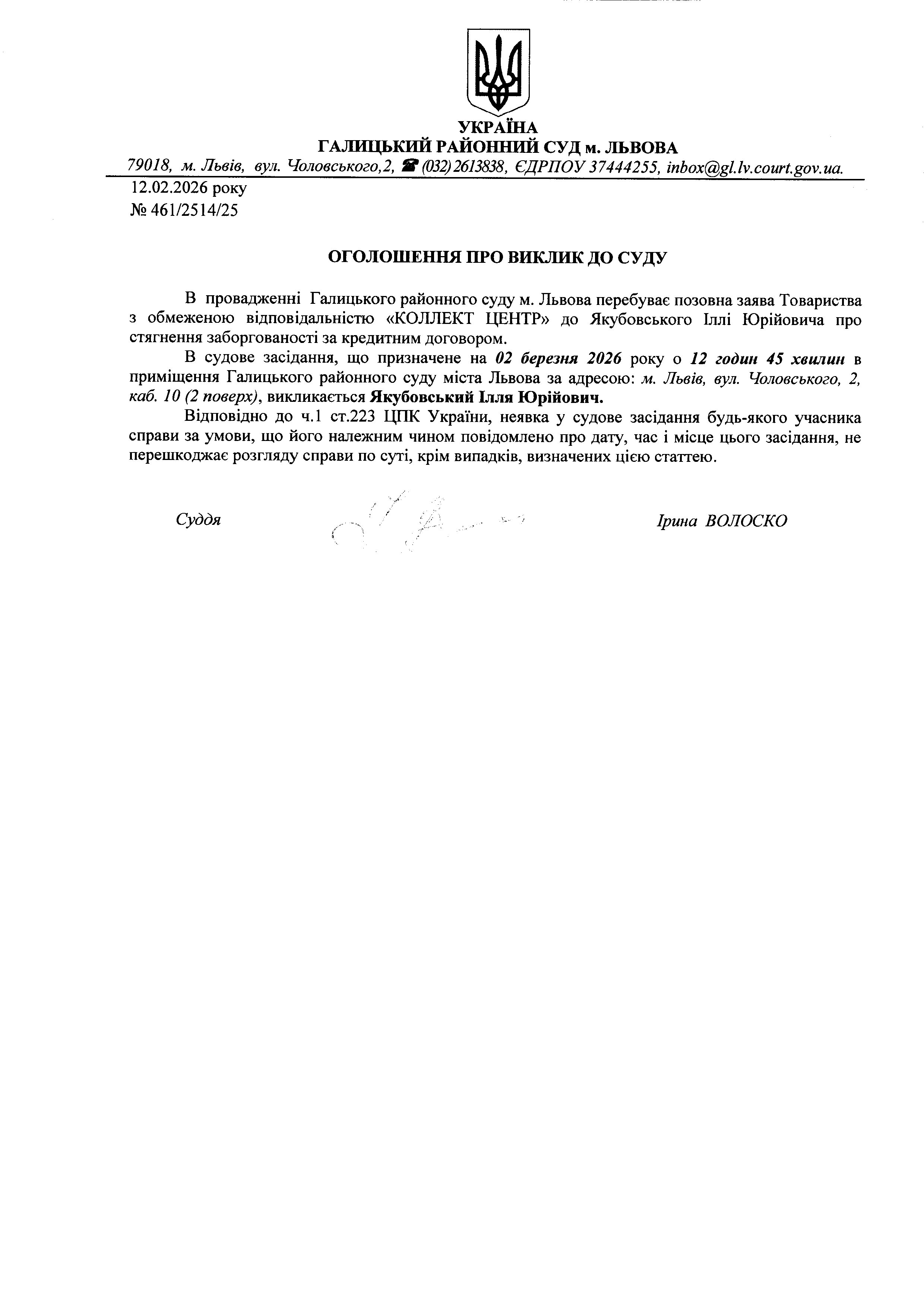 Оголошення про виклик до суду Якубовського І.Ю.