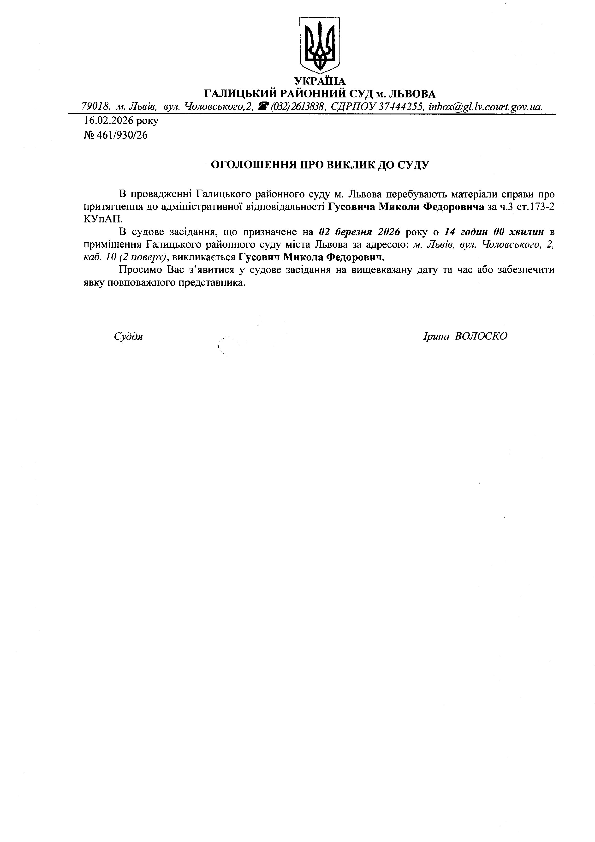 Оголошення про виклик до суду Гусовича М.Ф.