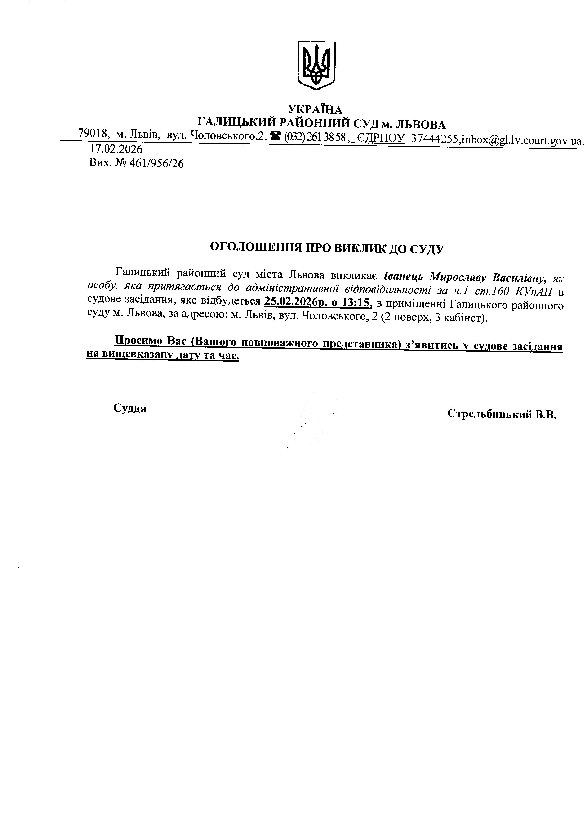 Оголошення про виклик до суду Іванець М.В.