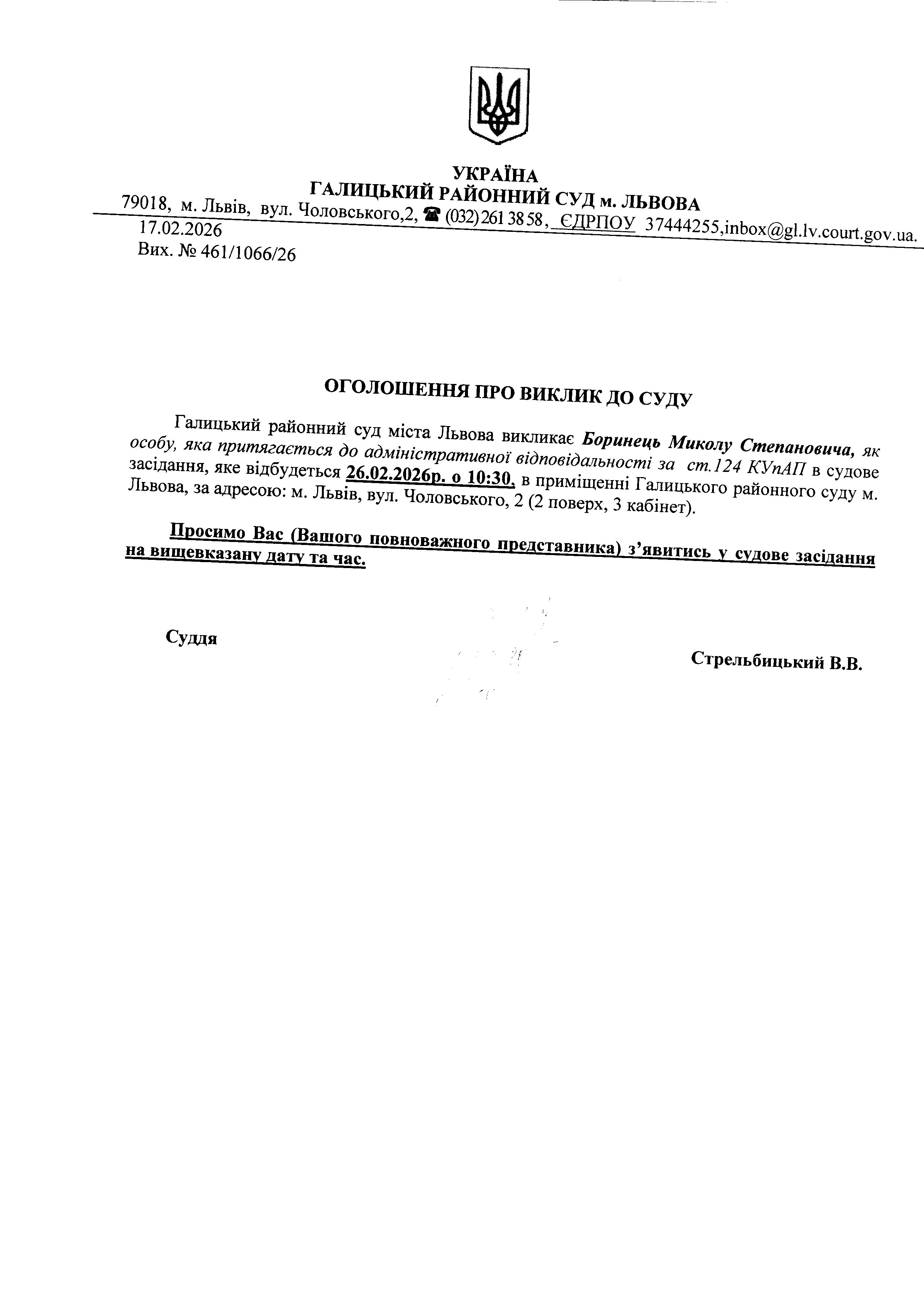 Оголошення про виклик до суду Боинець М.С.