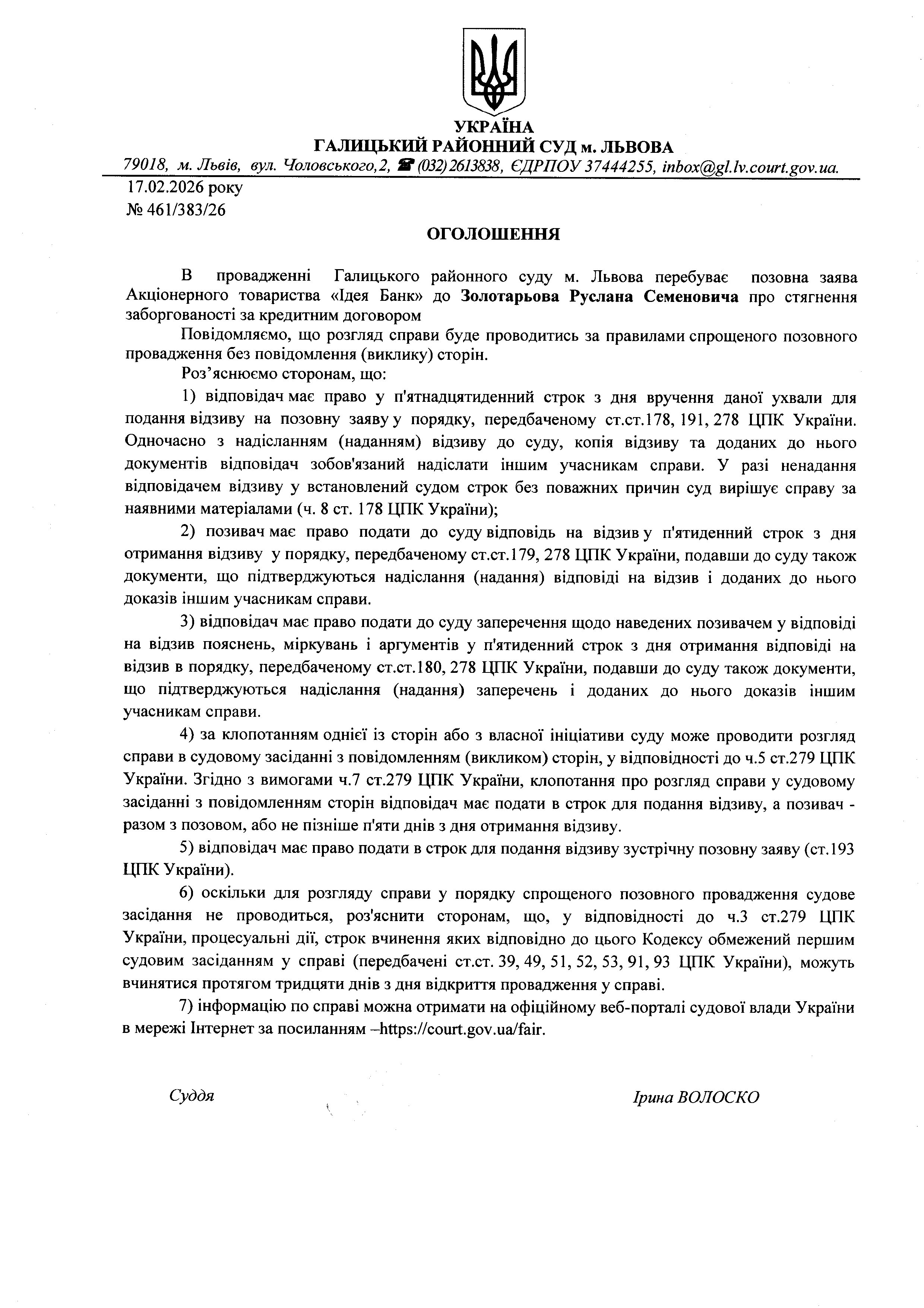 Оголошення про виклик до суду Золотарьова Р.С.