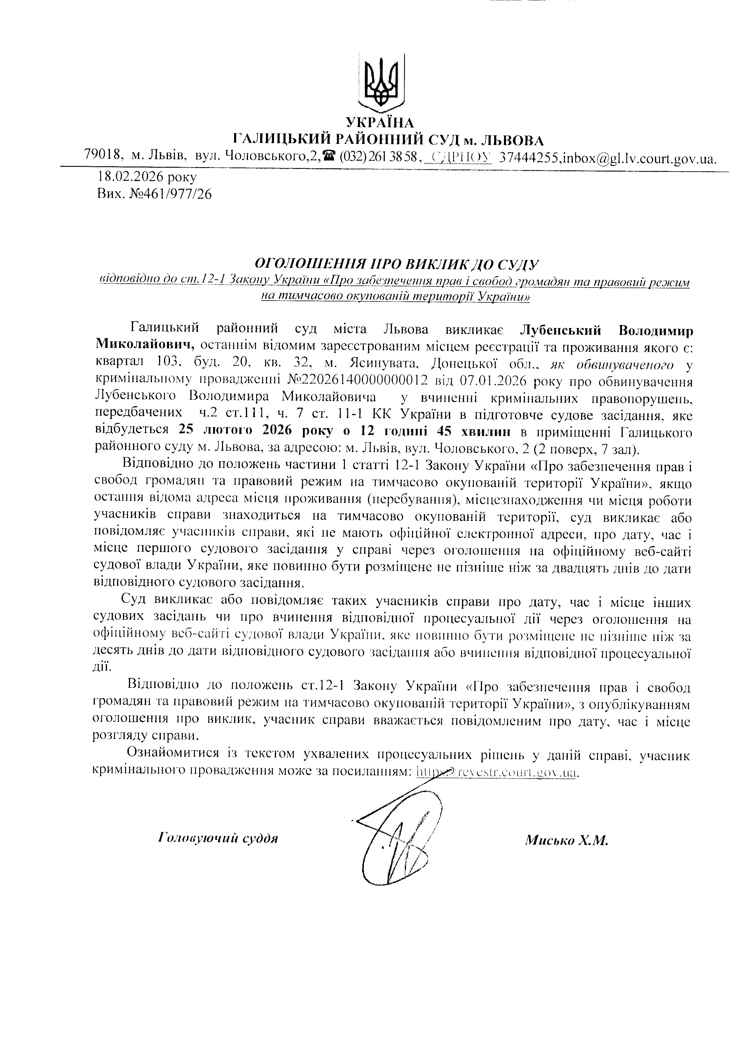 Оголошення про виклик до суду Лубенського В.М.