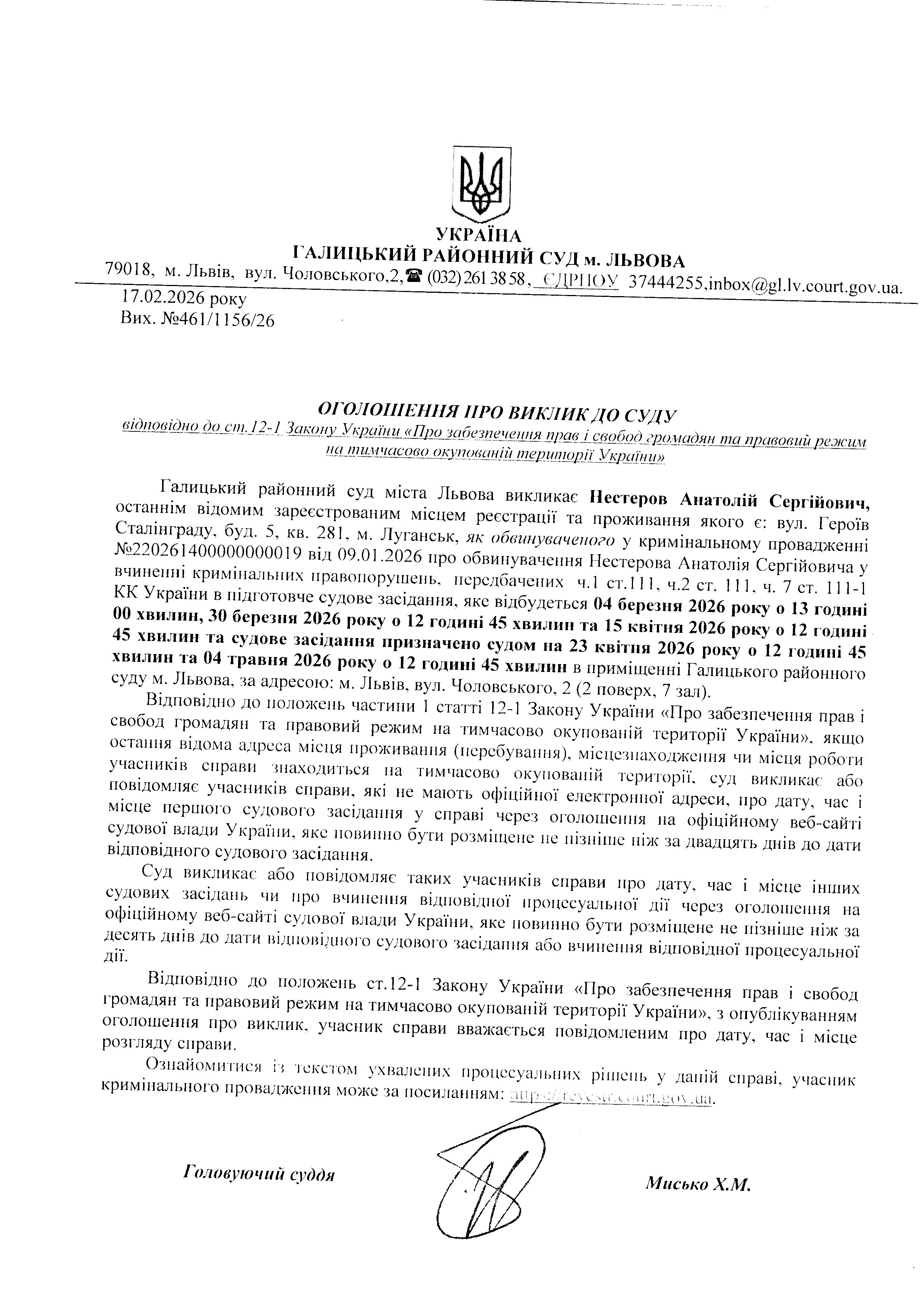 Оголошення про виклик до суду Нестерова А.С.