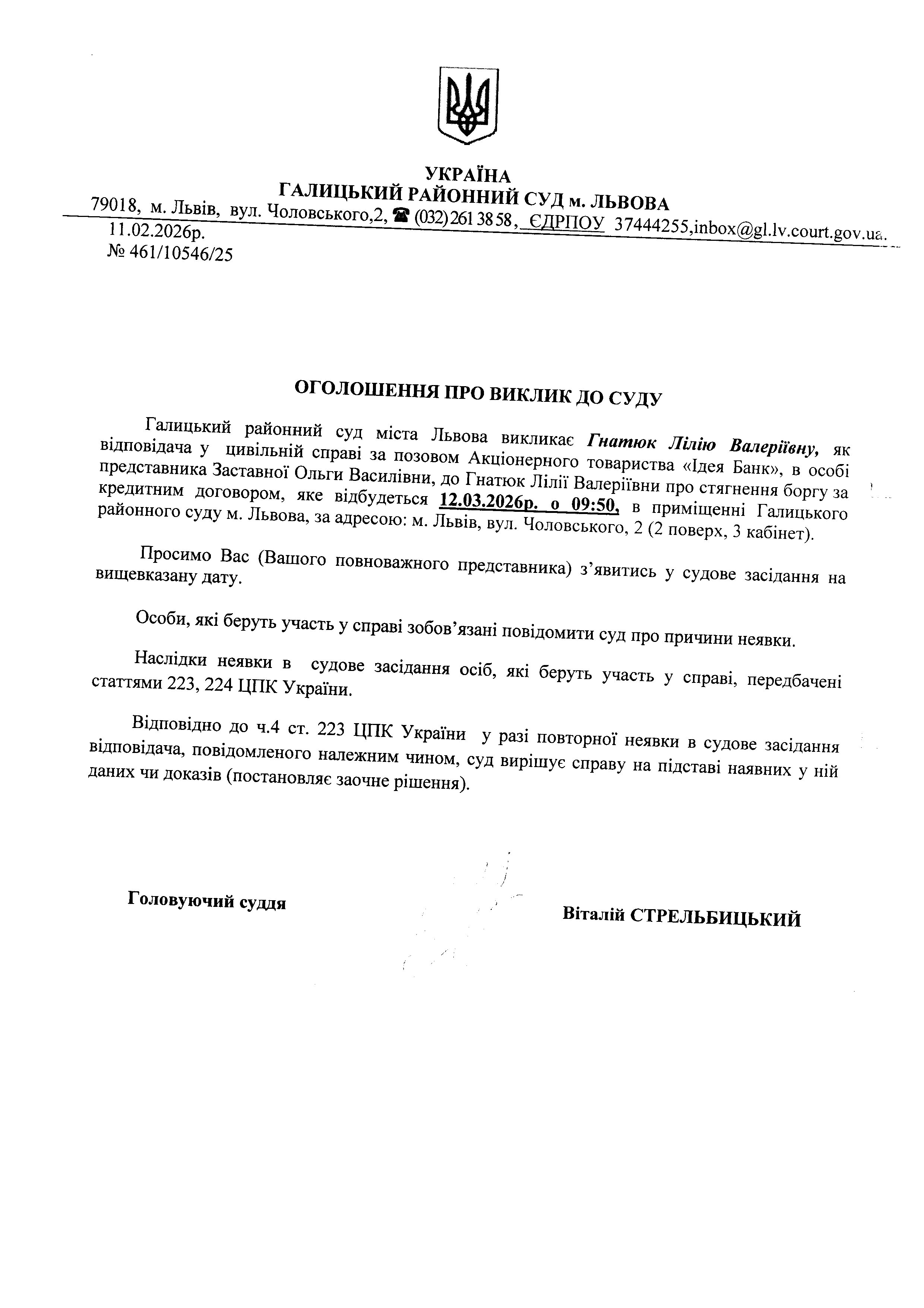 Оголошення про виклик до суду Гнатюк Л.В.