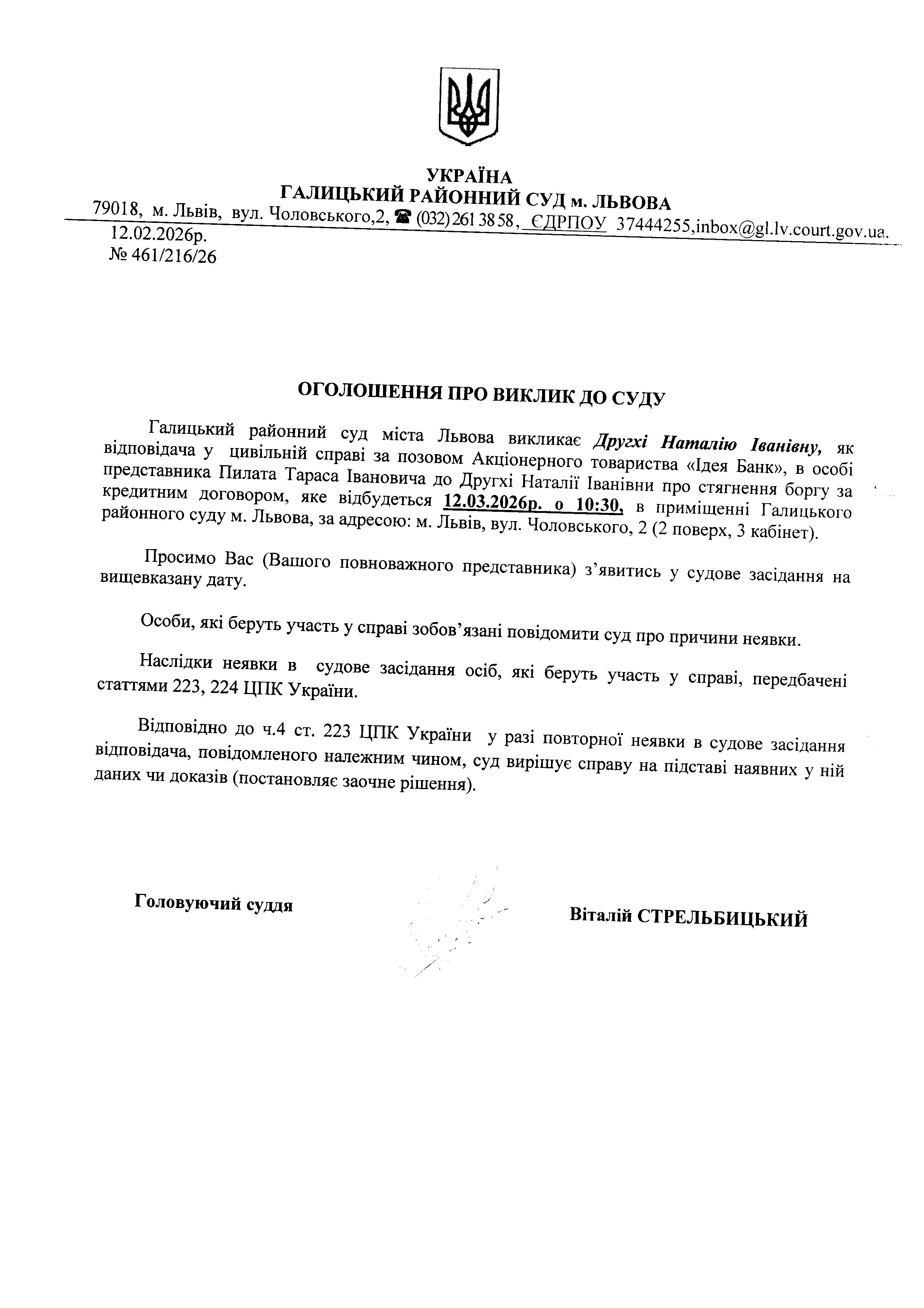 Оголошення про виклик до суду Другхі Н.І.