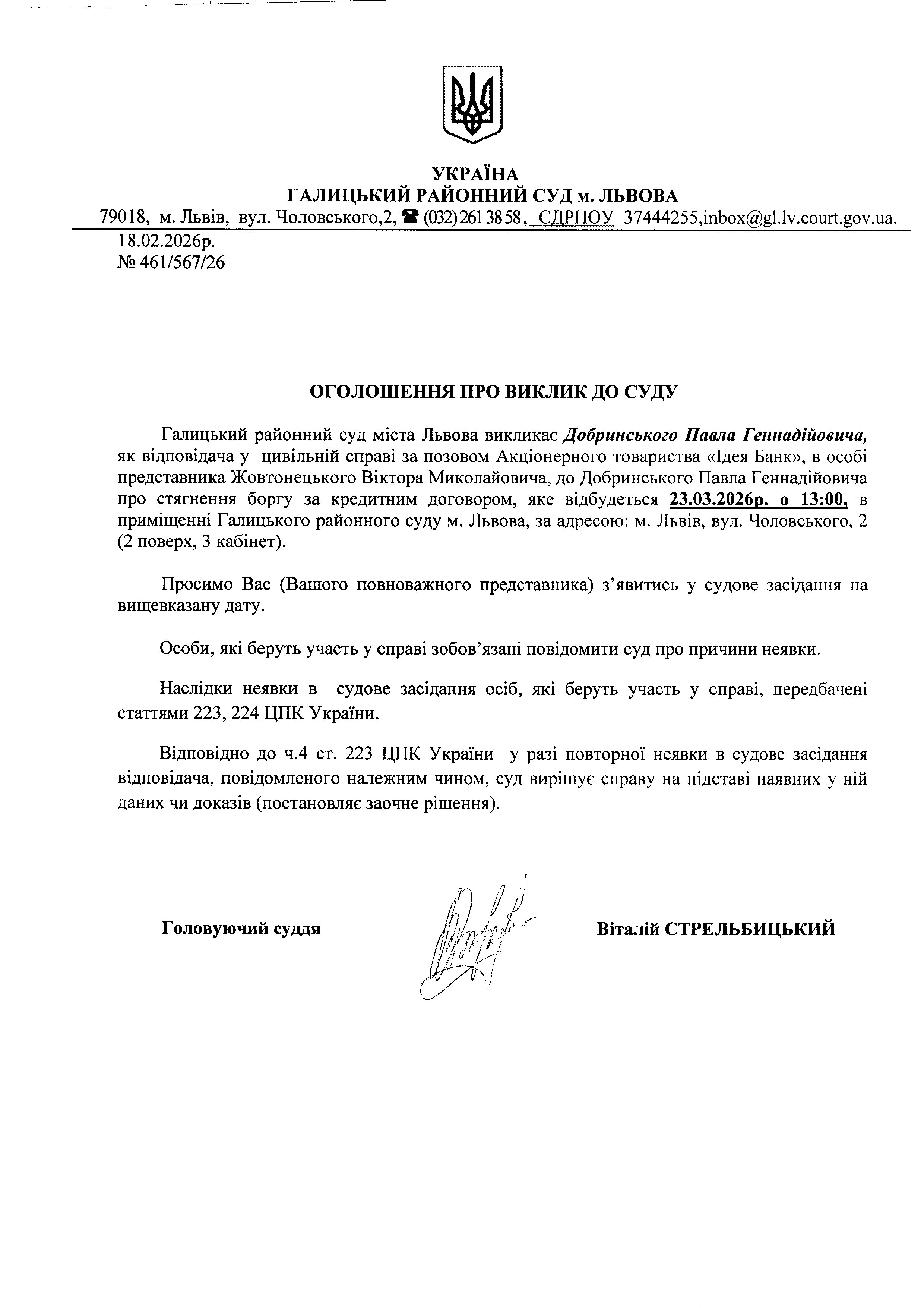 Оголошення про виклик до суду Добринського П.Г.