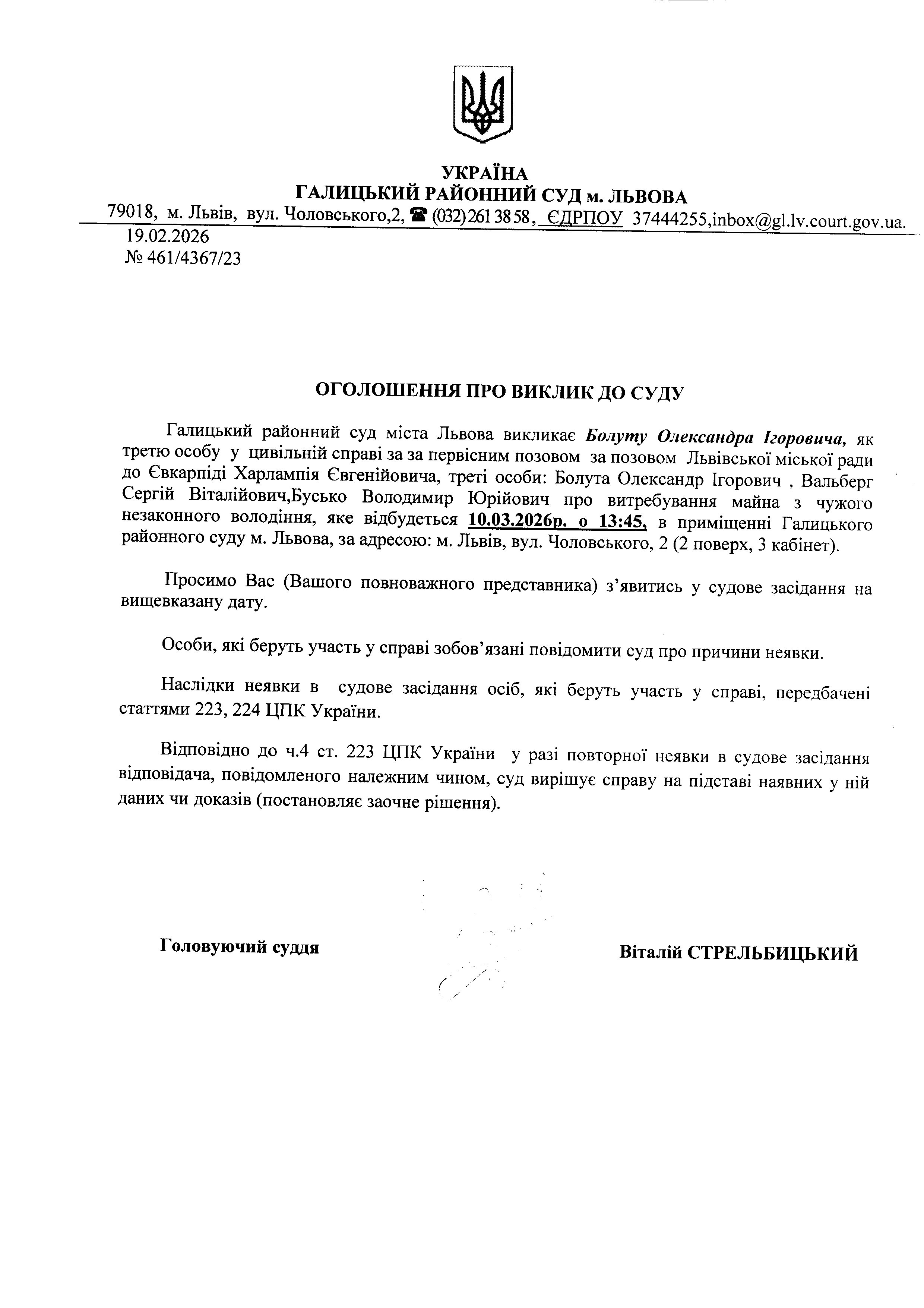 Оголошення про виклик до суду Болуту О.І.