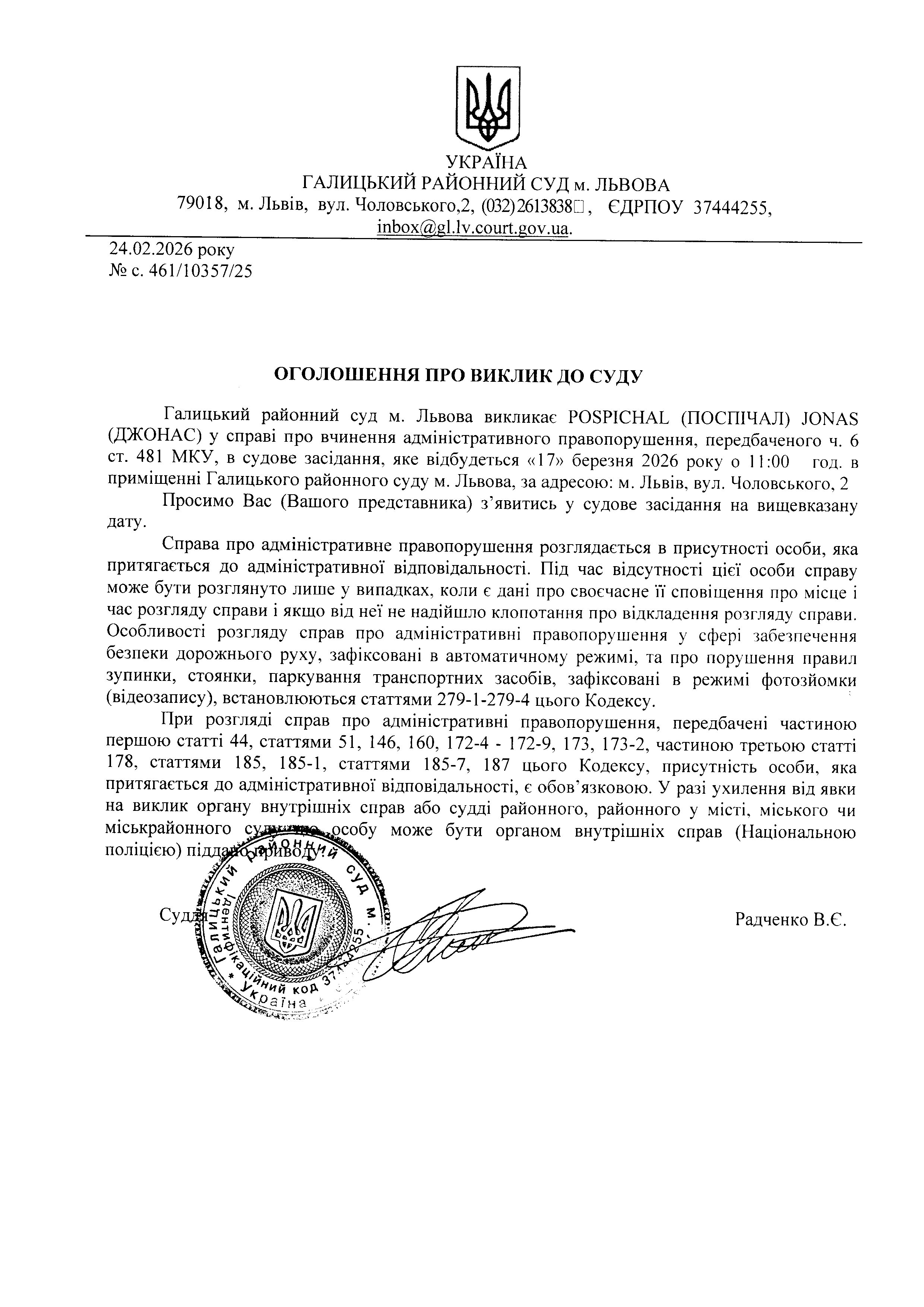 Оголошення про виклик до суду Поспічал Д.