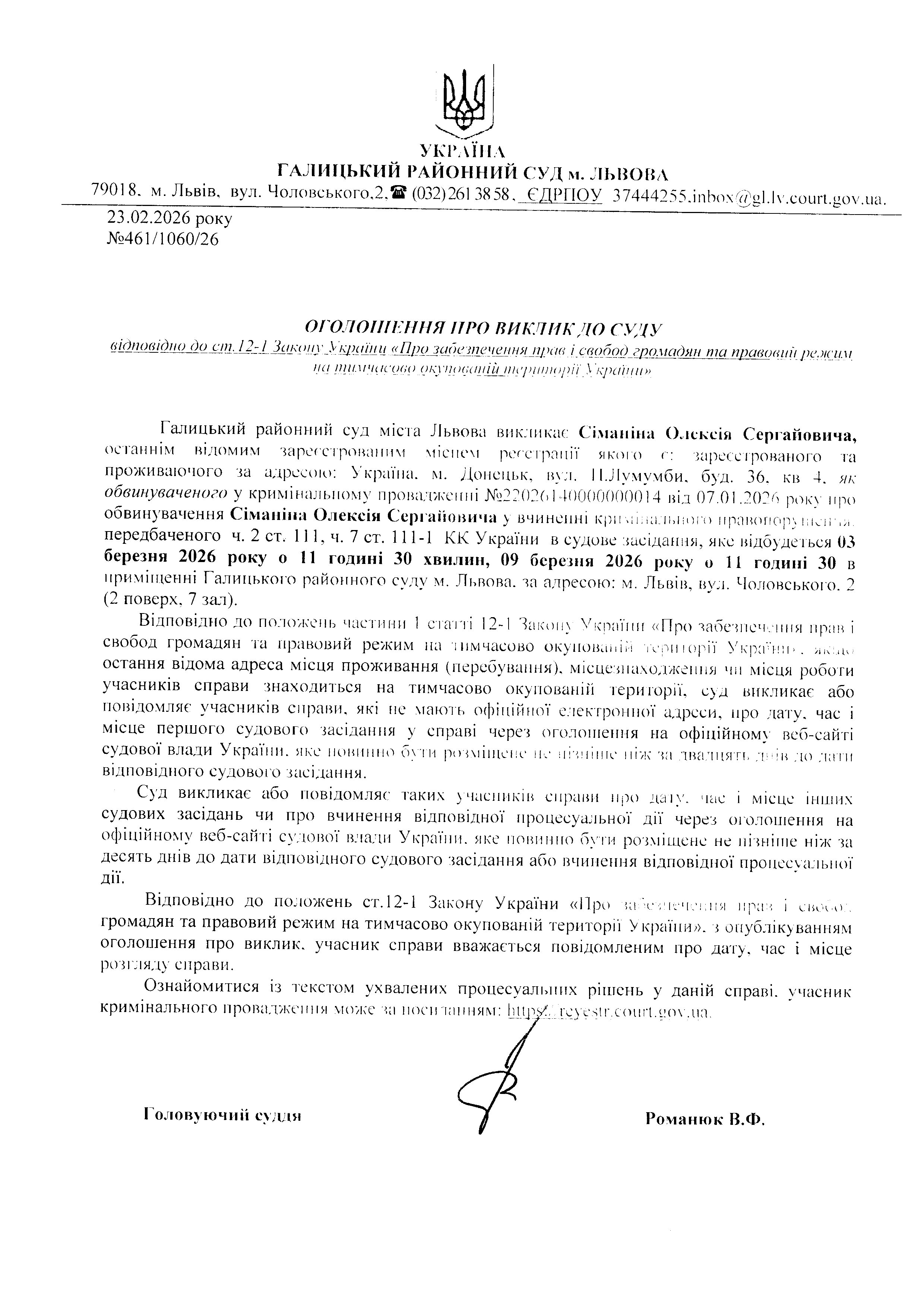 Оголошення про виклик до суду Сіманіна О.С.