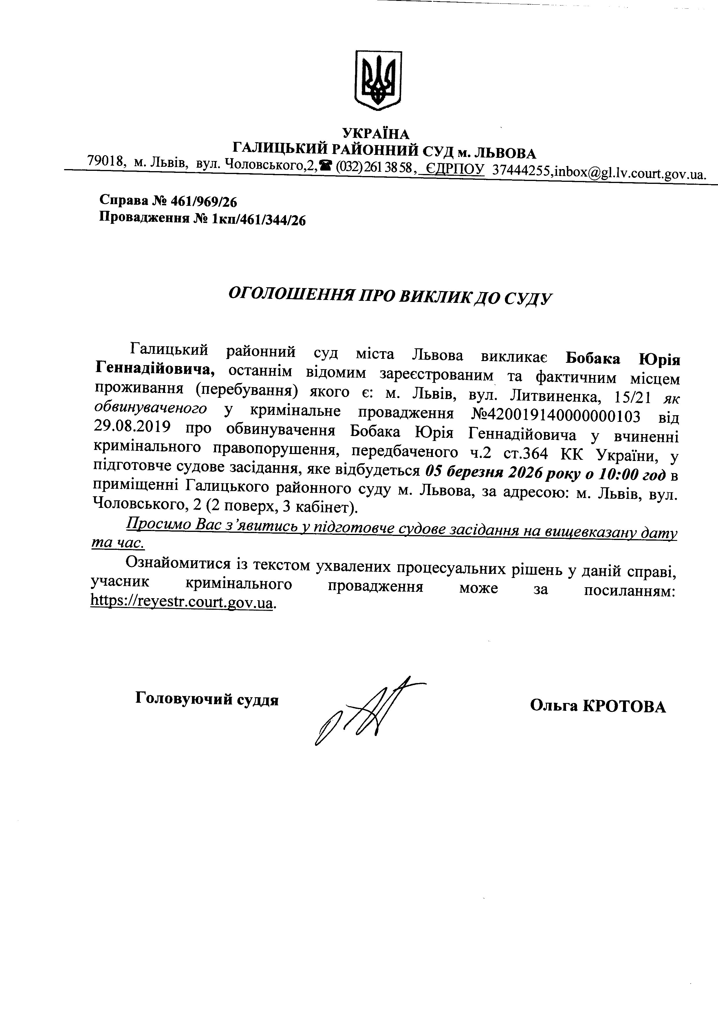 Оголошення про виклик до суду Бобака Ю.Г.
