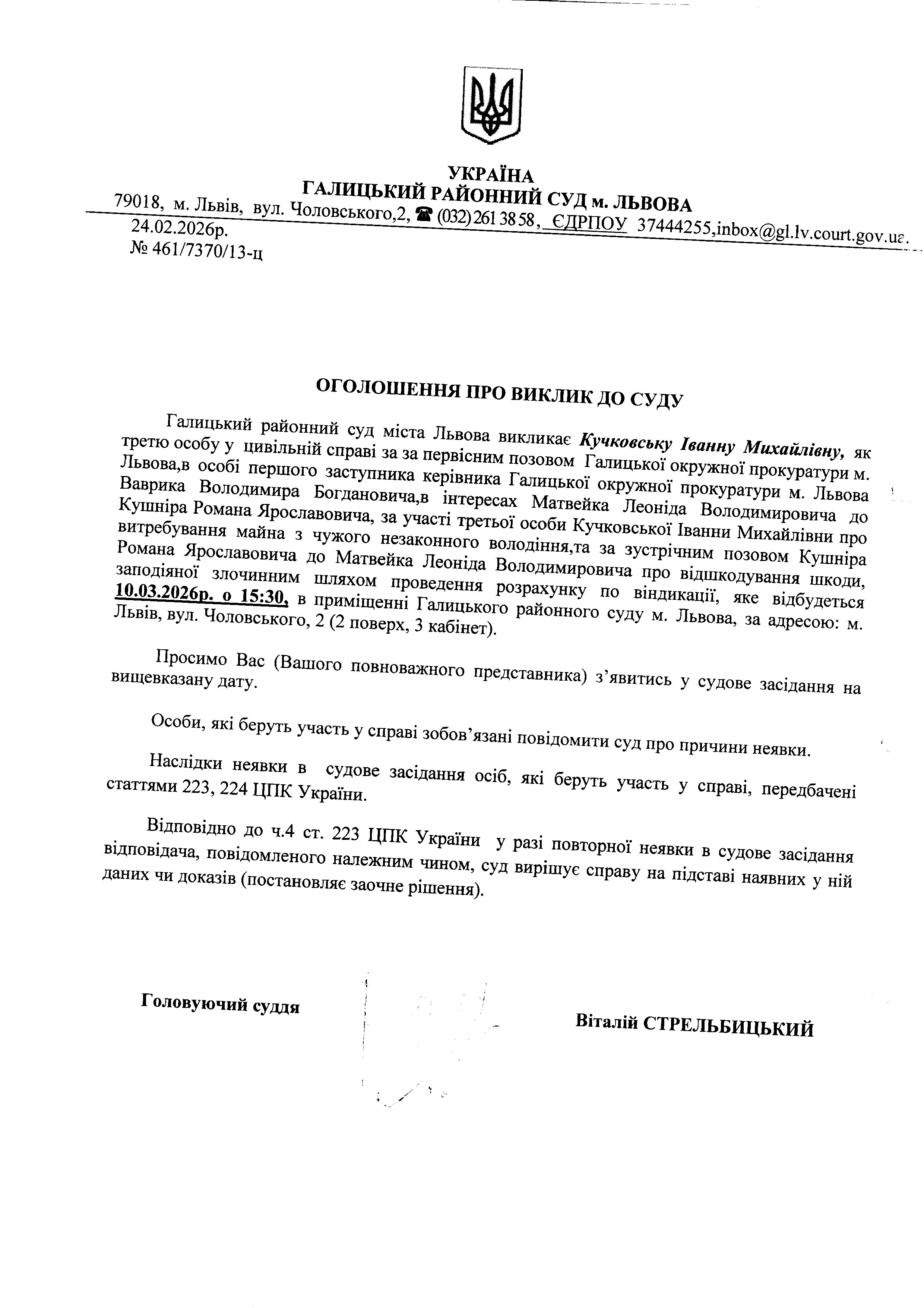 Оголошення про виклик до суду Кучковської І.М.