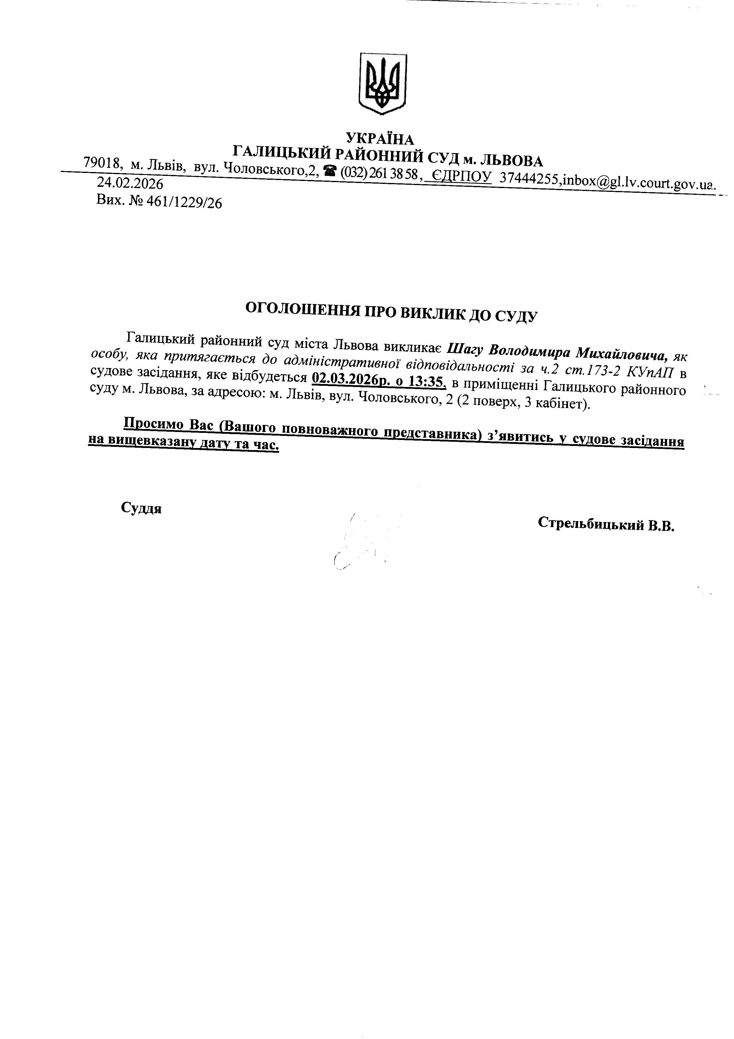 Оголошення про виклик до суду Шагу В.М.
