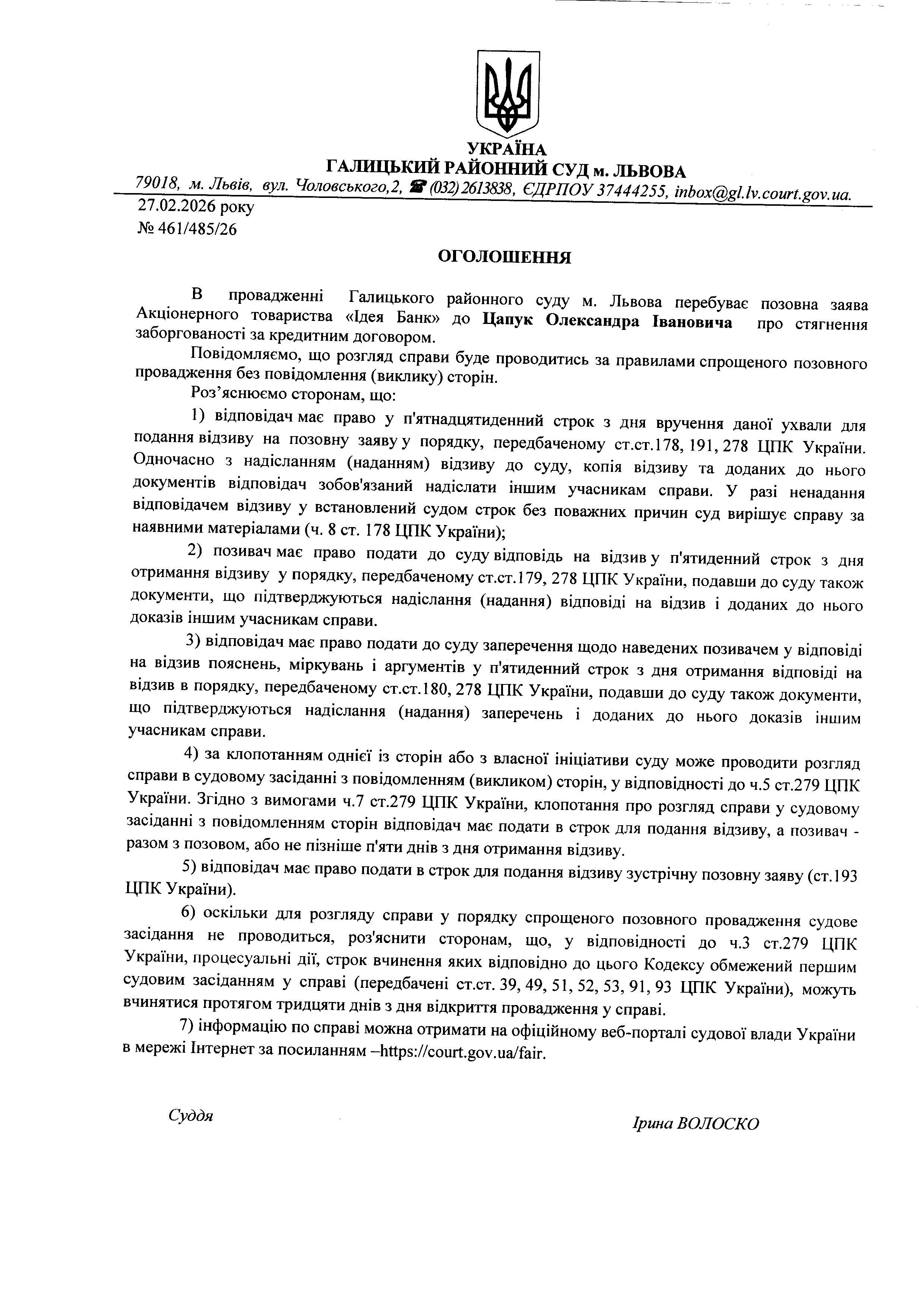 Оголошення про виклик до суду Цапук О.І.