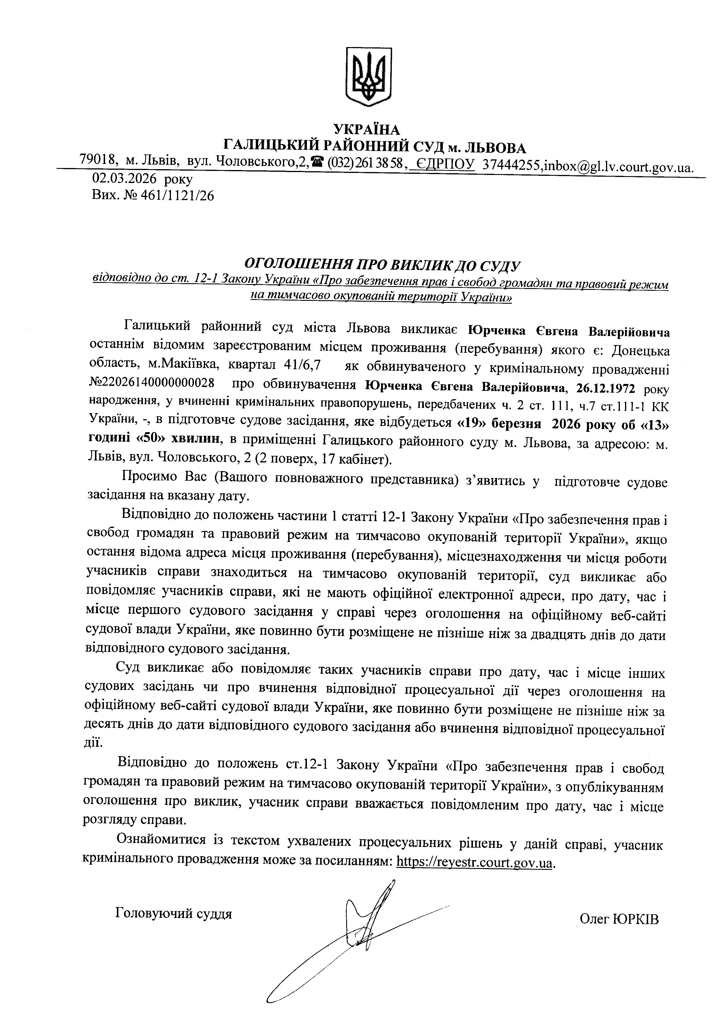 Оголошення про виклик до суду Юрченка Є.В.