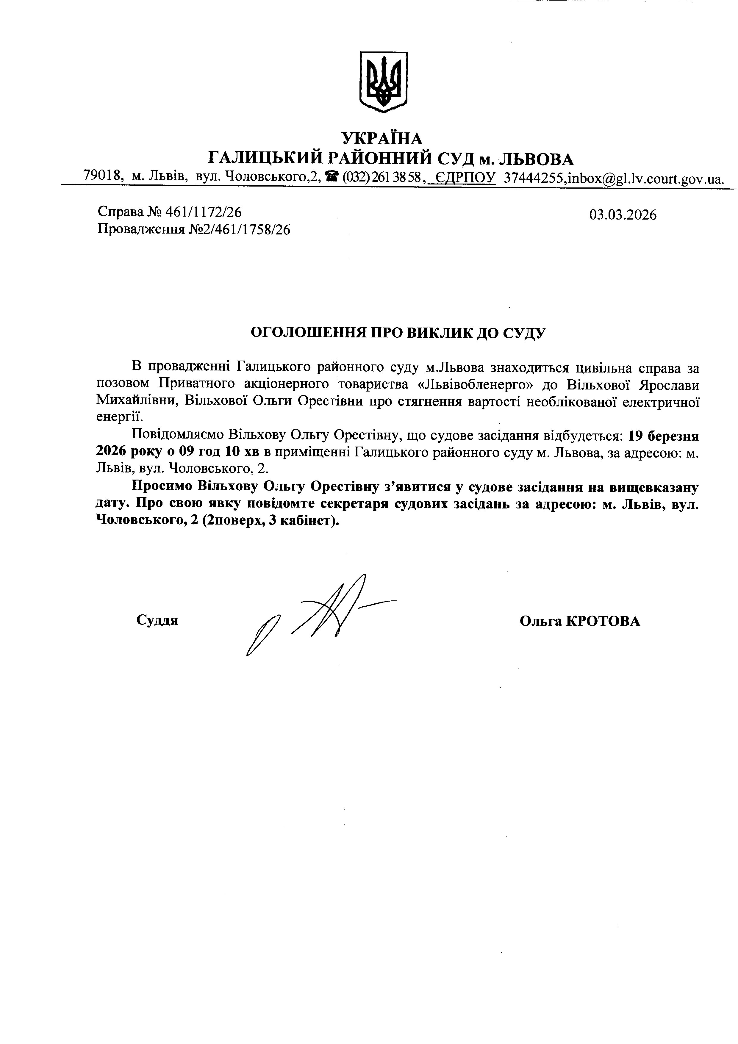 Оголошення про виклик до суду Вільхової О.О.