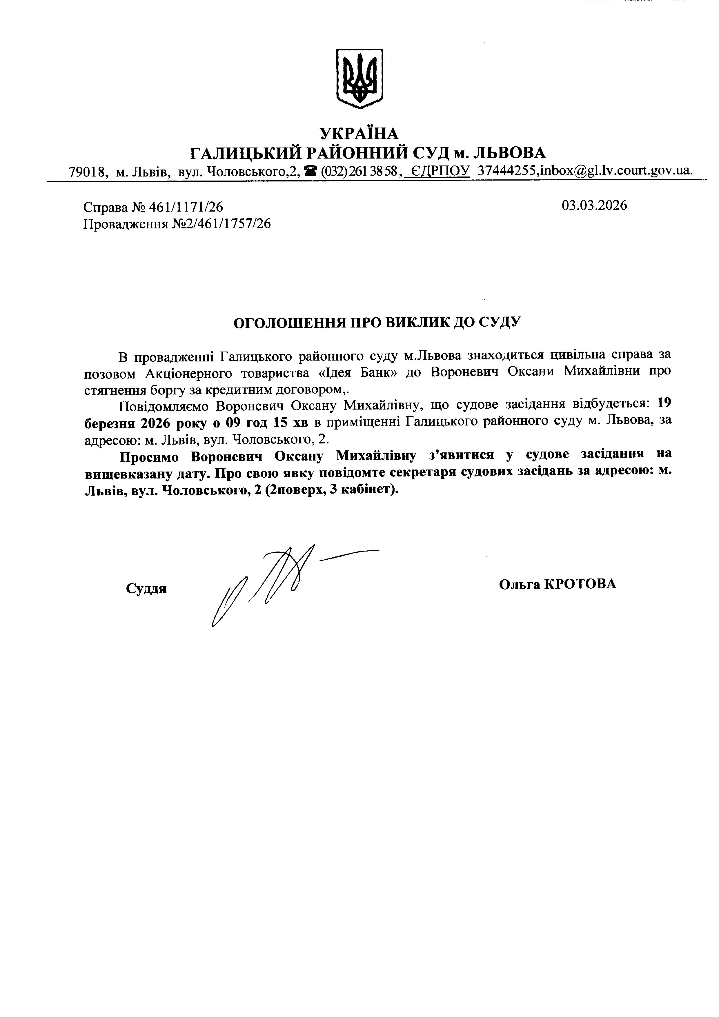 Оголошення про виклик до суду Вороневич О.М.