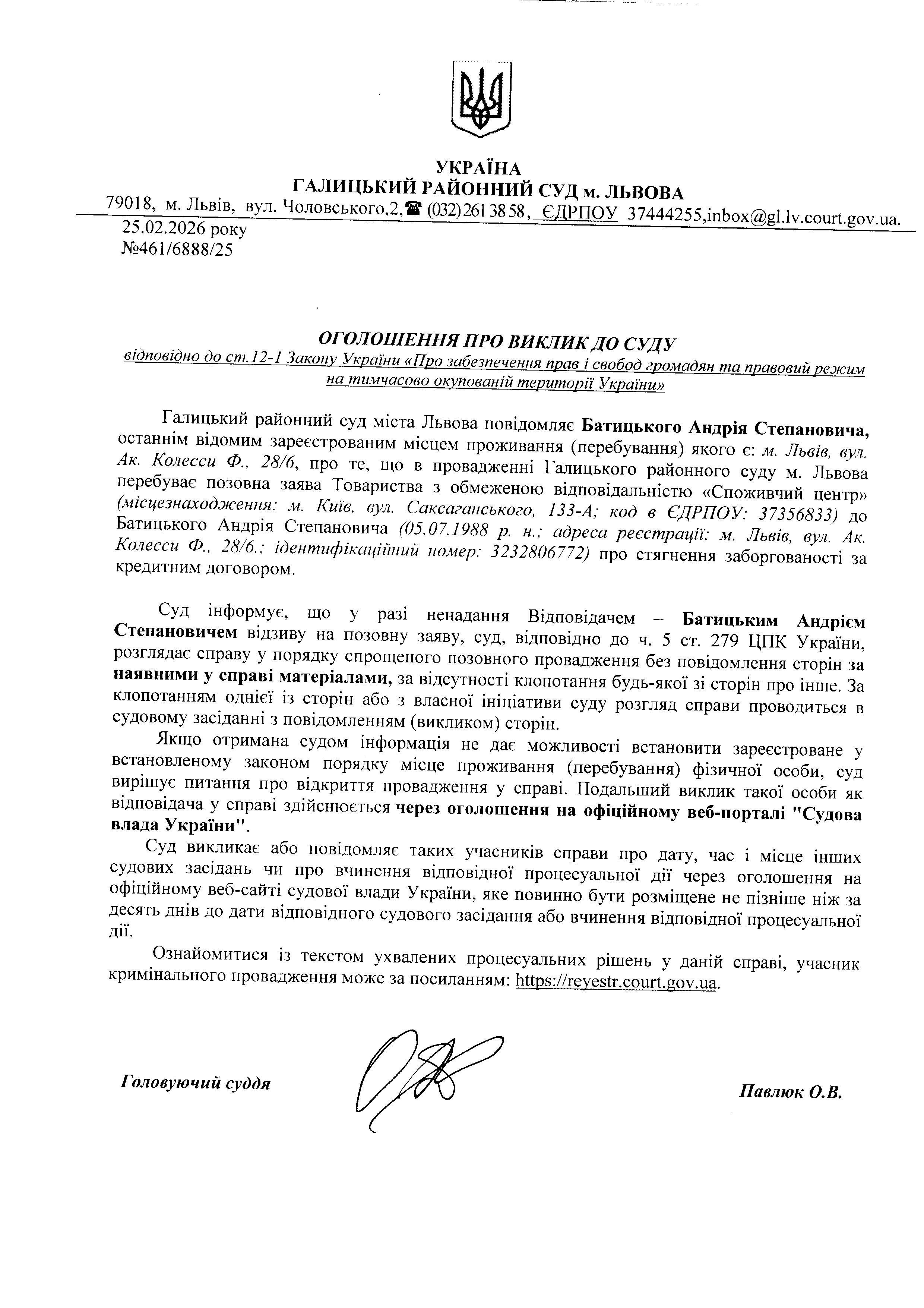 Оголошення про виклик до суду Батицького А.С.