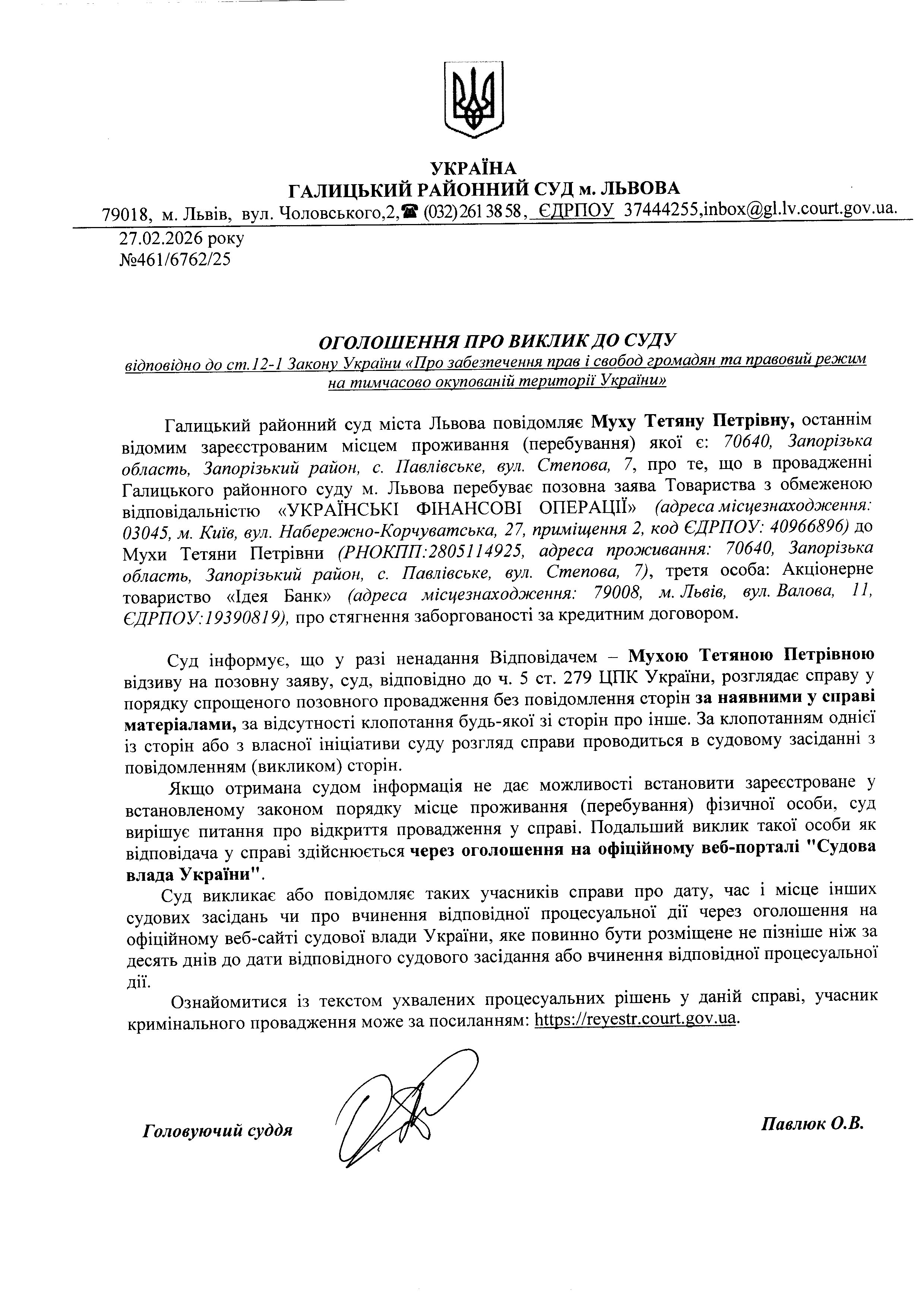 Оголошення про виклик до суду Мухи Т.П.