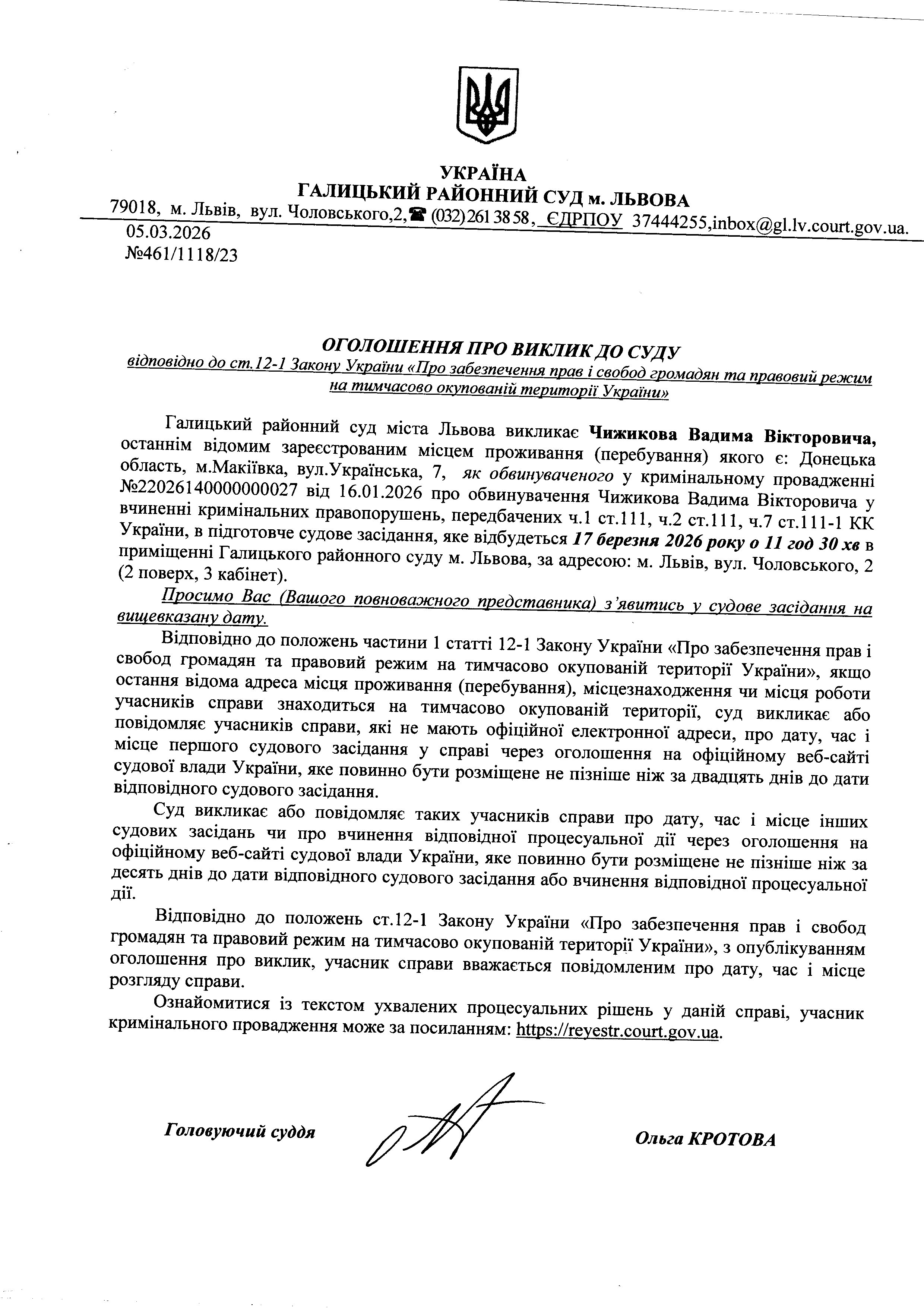 Оголошення про виклик до суду Чижикова В.В.
