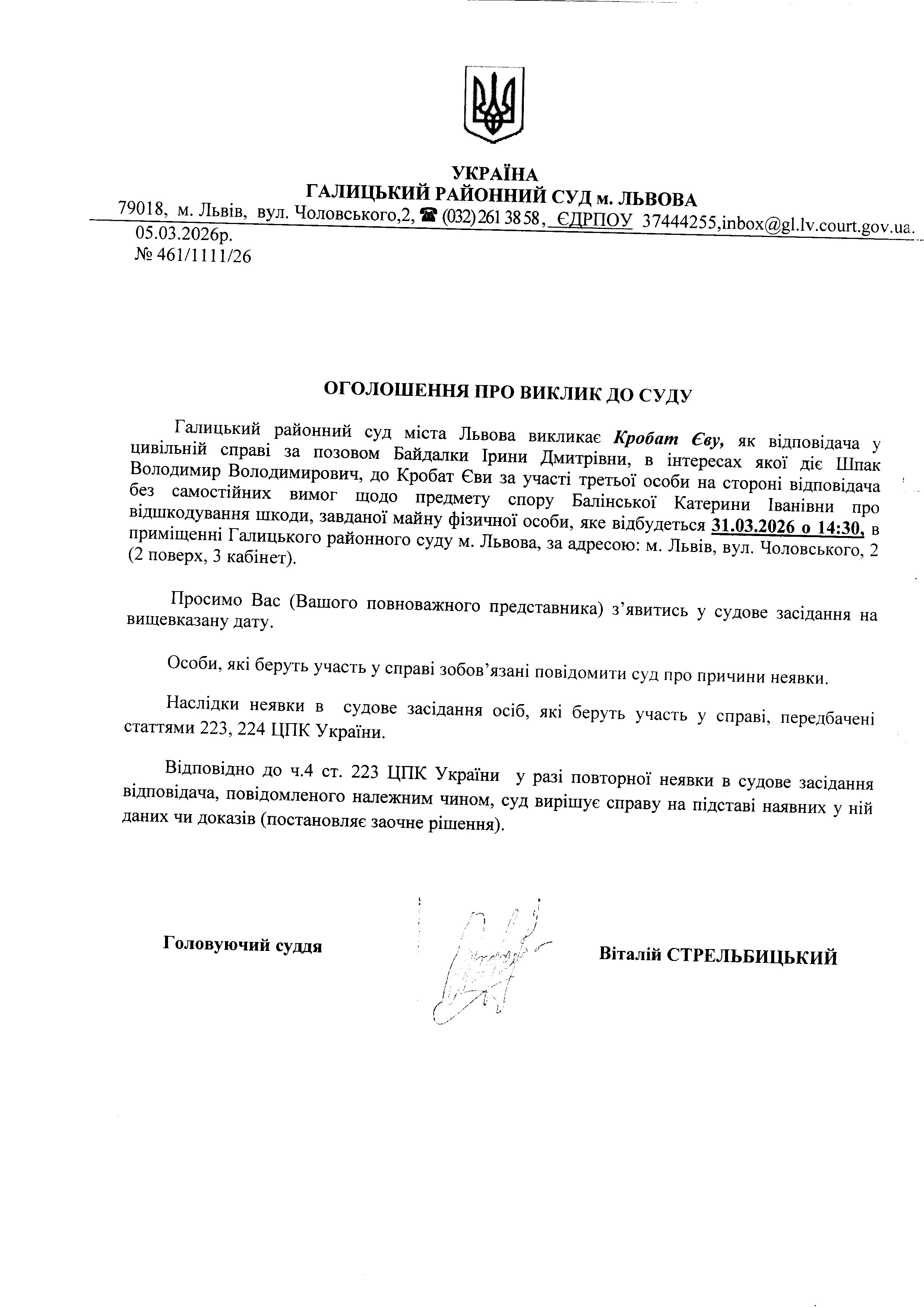 Оголошення про виклик до суду Коробат Є.