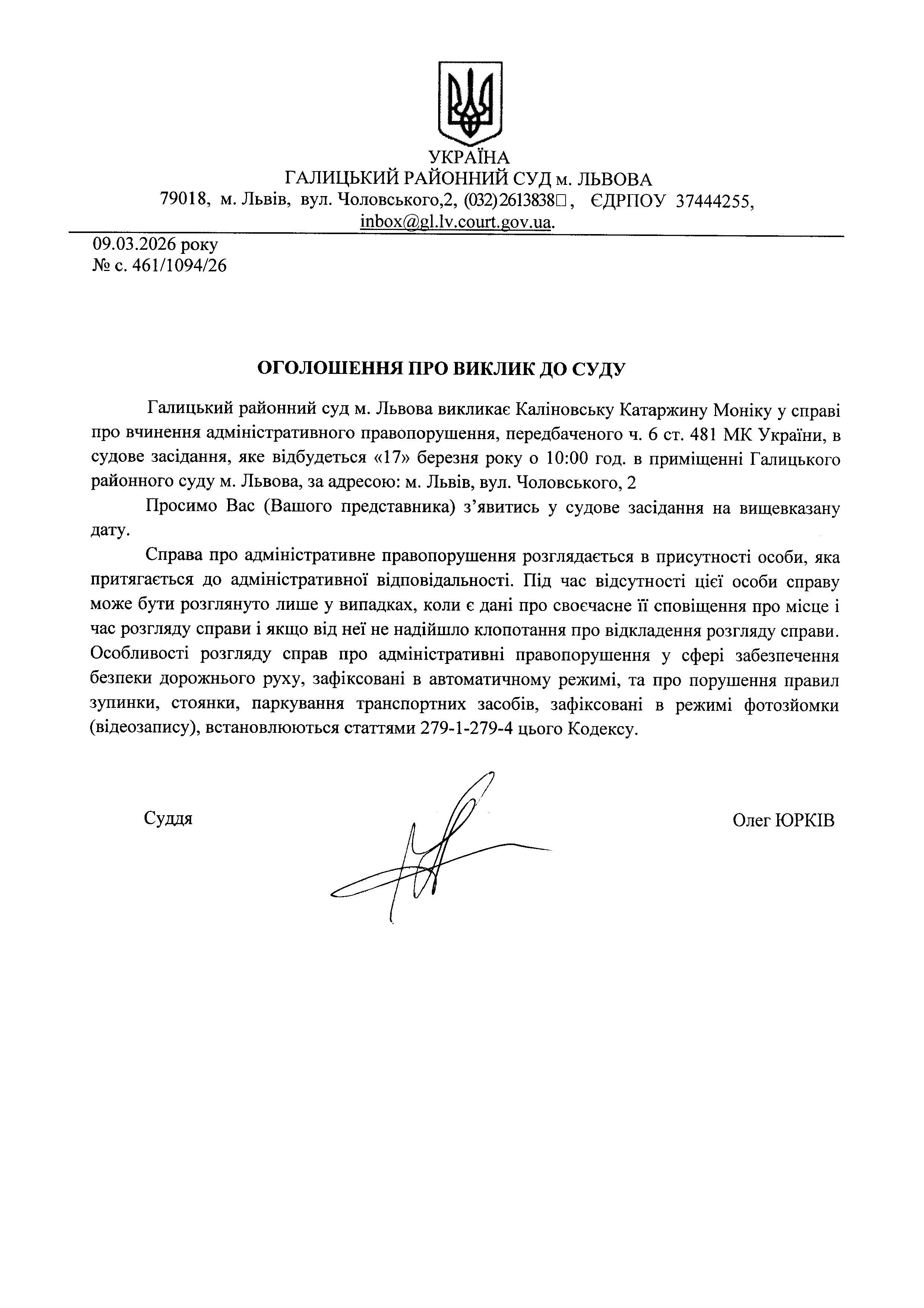 Оголошення про виклик до суду Каліновську К.М.