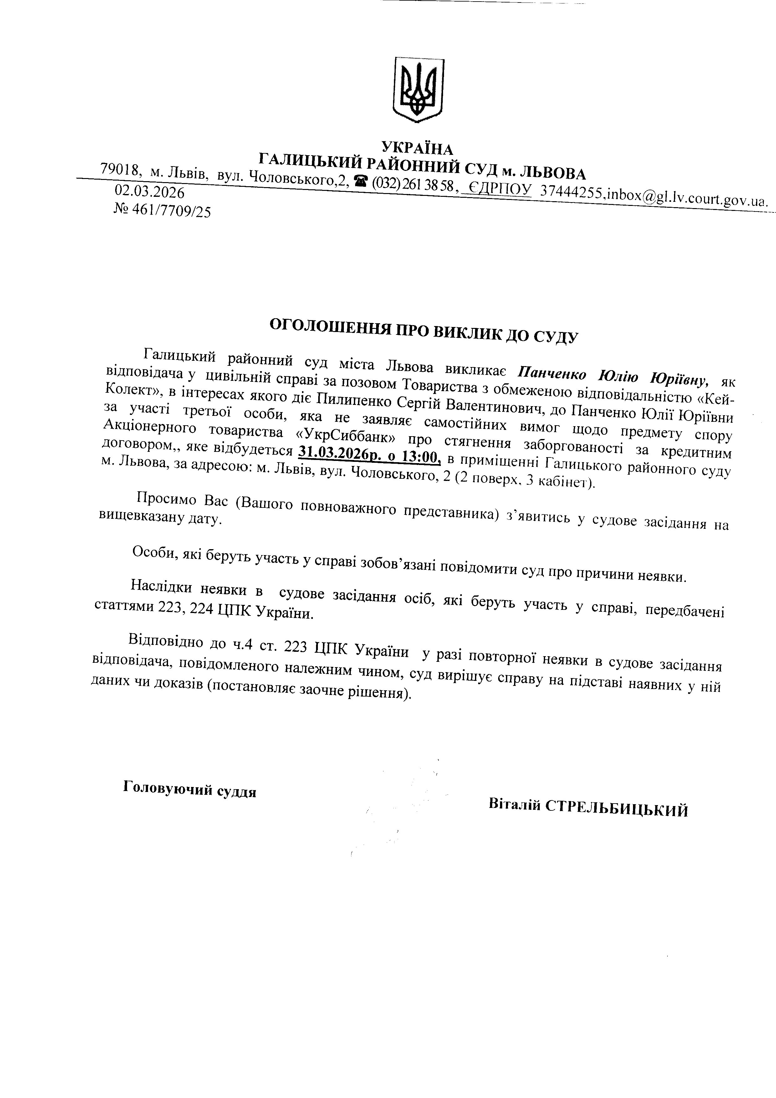 Оголошення про виклик до суду Панченко Ю.Ю.