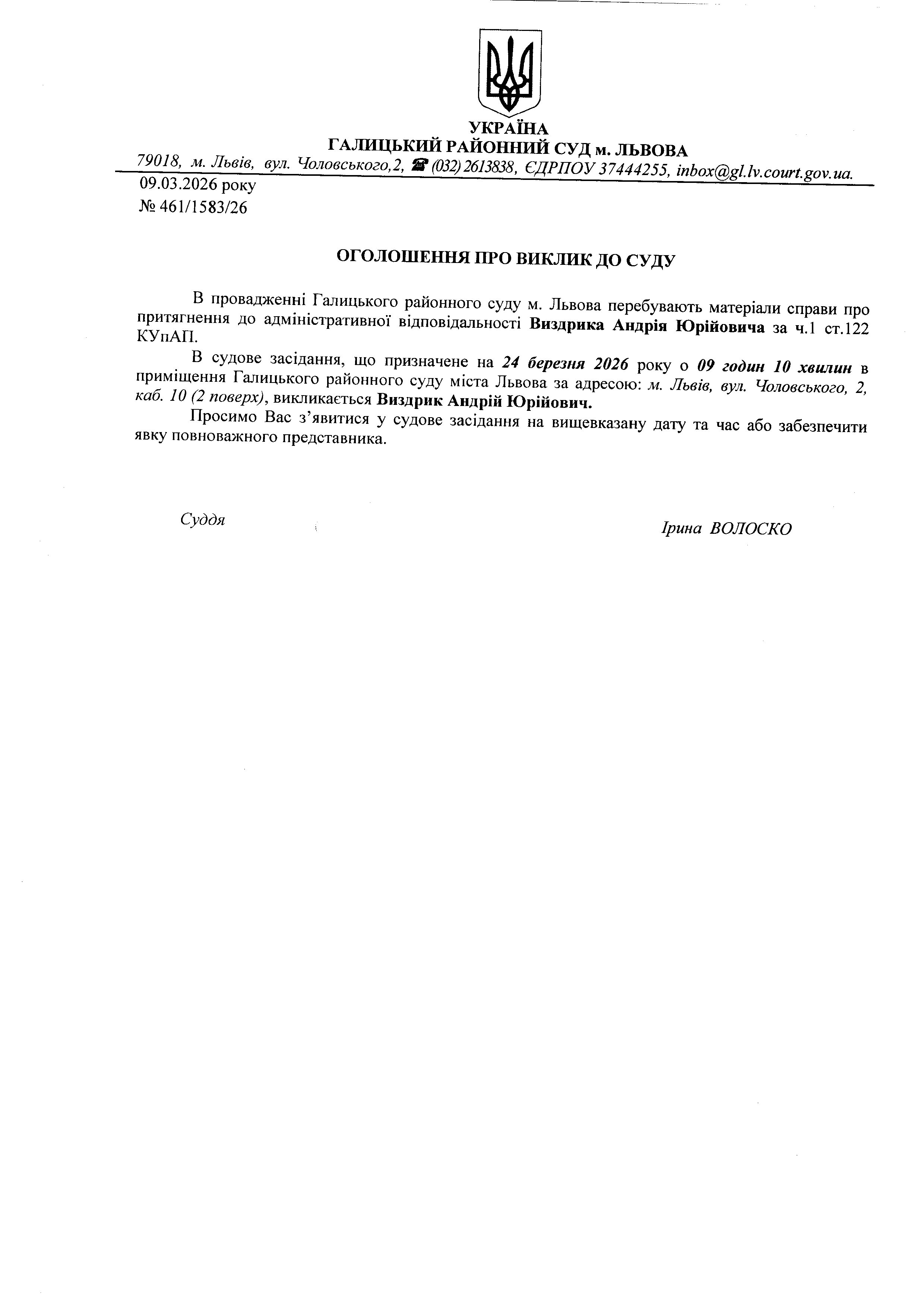 Оголошення про виклик до суду Виздрика А.Ю.