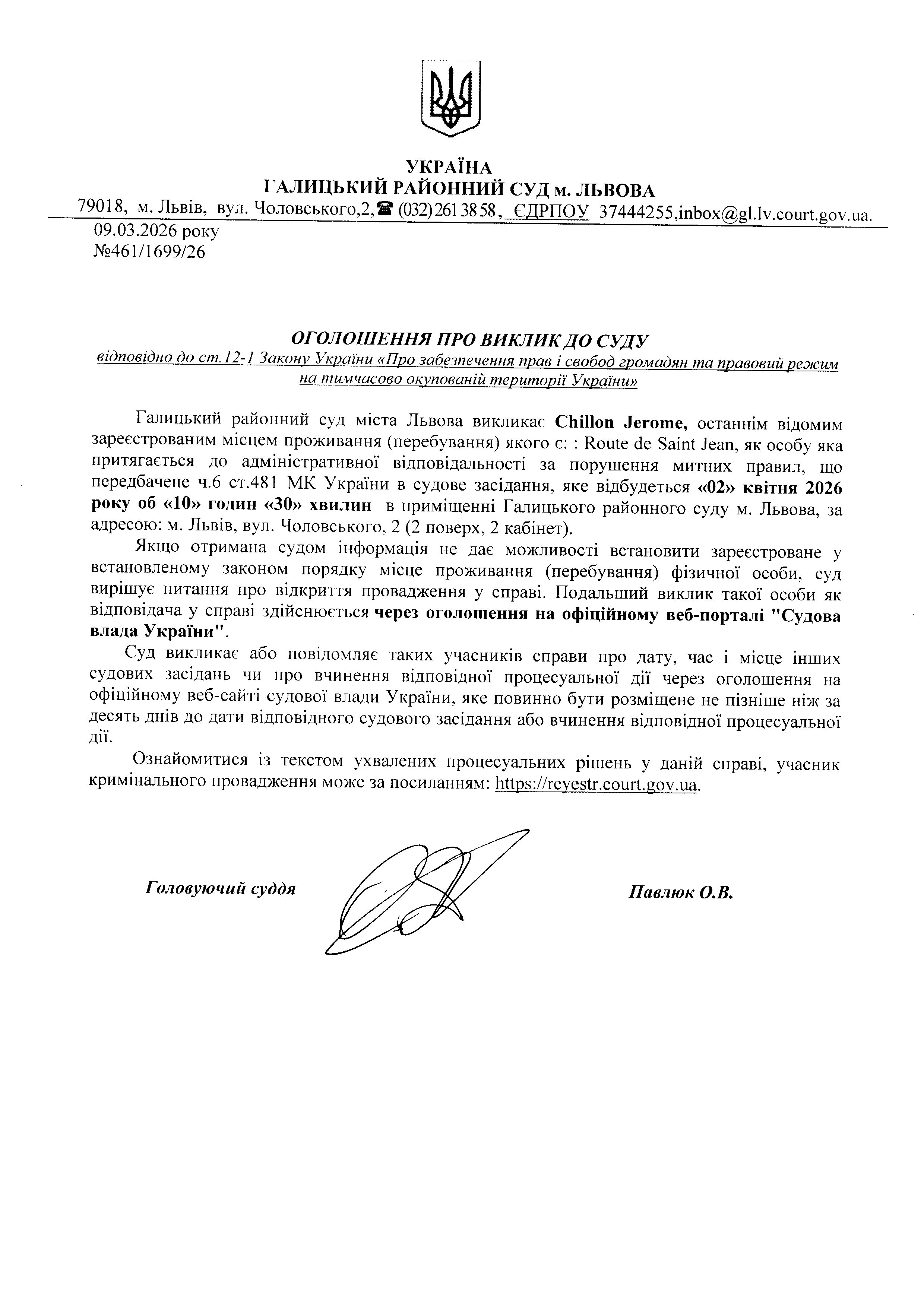 Оголошення про виклик до суду Сhillon Jerome