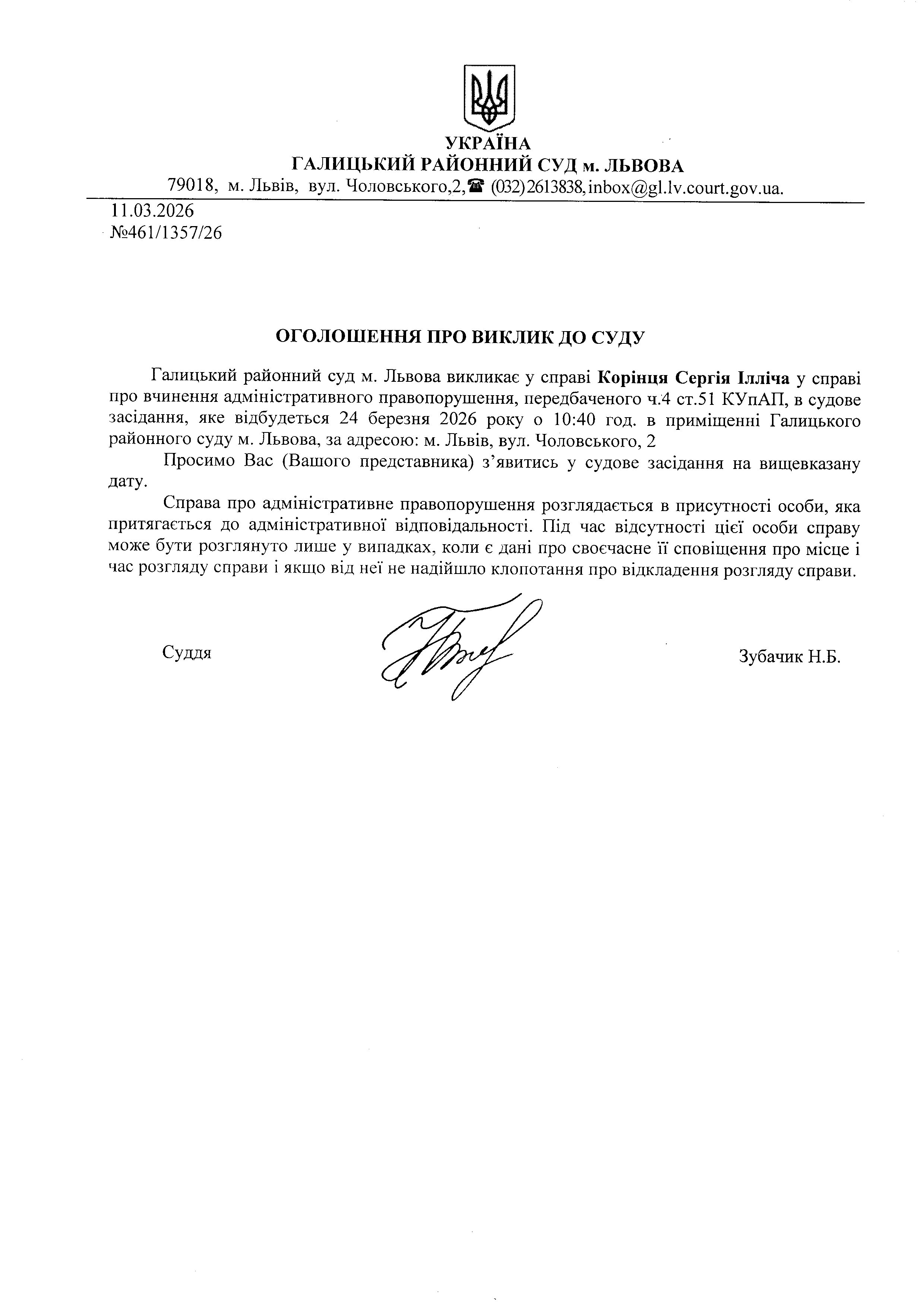 Оголошення про виклик до суду Корінця С.І.