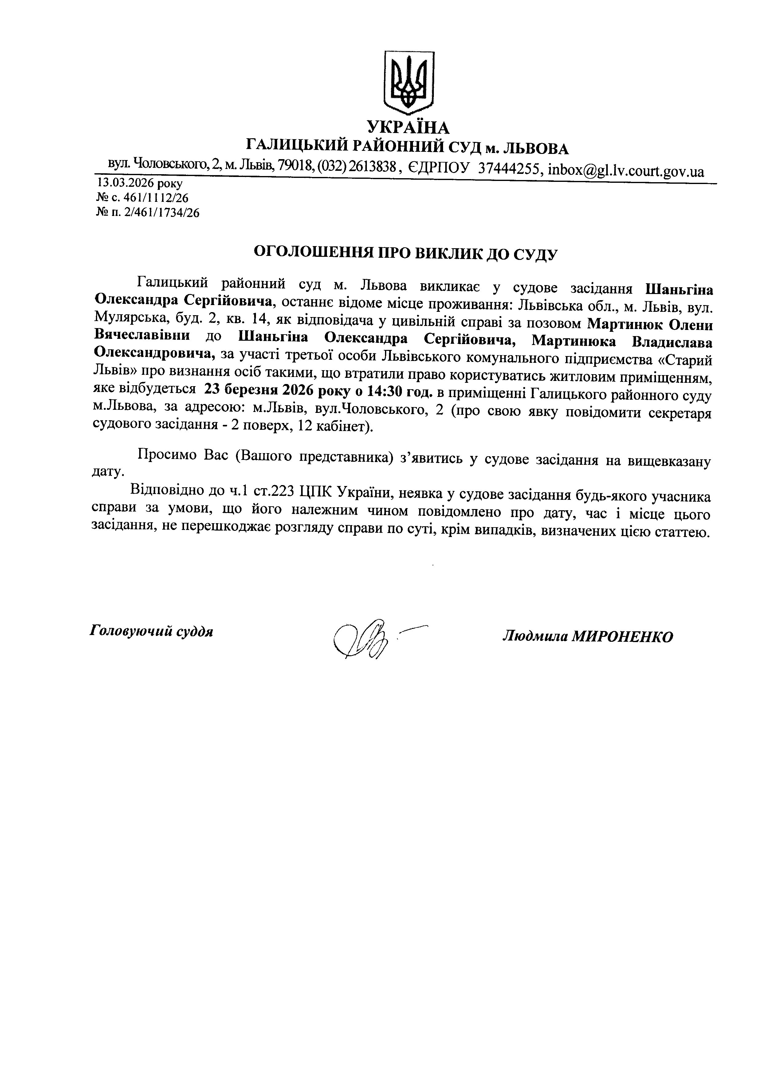 Оголошення про виклик до суду Шаньгіна О.С.