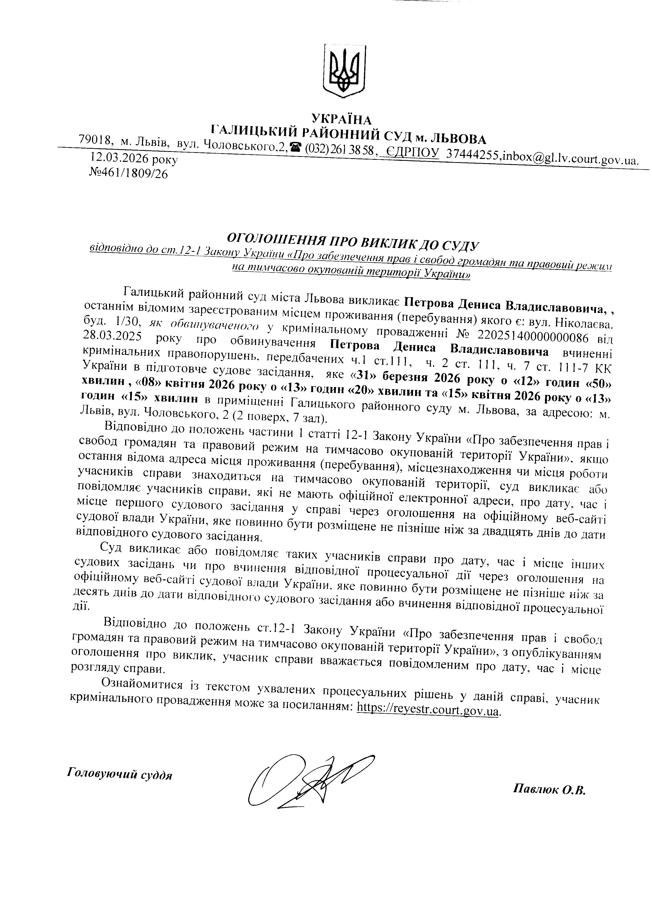 Оголошення про виклик до суду Петрова Д.В.